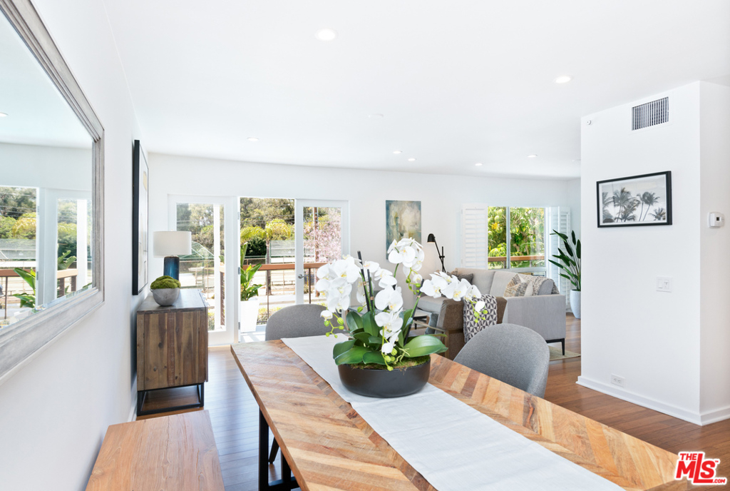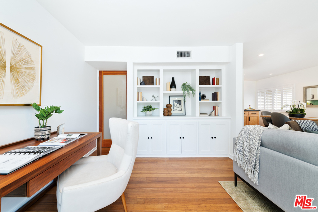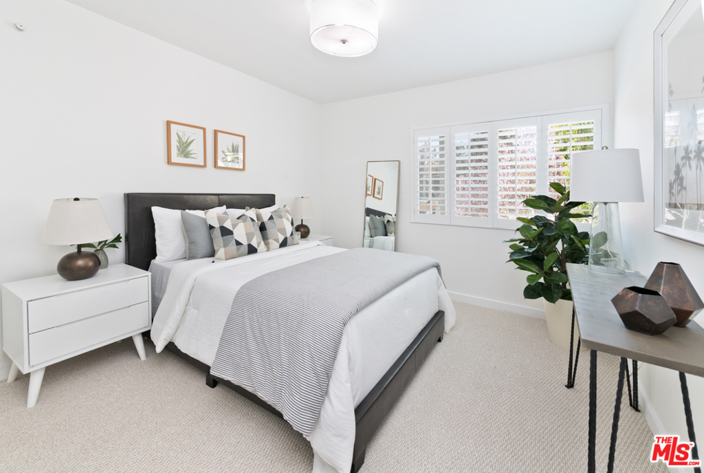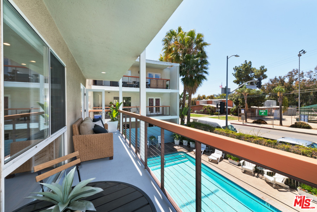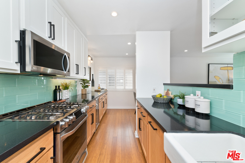 Exquisite designer remodel in the superb location of Brentwood Village! This light filled unit offers an open floorplan, with the ability to have a home office as well as an oversized outdoor balcony space with colorful views of the pool and flowering crepe myrtle trees. The gourmet kitchen features black granite counters highlighted by a rich teal colored glass tile backsplash, all new fixtures and LG appliances; specifically, a French door styled refrigerator, separate wine fridge, farm style sink, convection oven, microwave, along with extended cabinetry to the dining area. The spacious primary bedroom has a luxurious full bath with Carrera marble double vanity, and cat eye tile tub and shower surround. Both baths feature decorator vanities and superb tile selection, both bedroom closets have been customized to provide maximum space. An in-unit laundry area features its own additional storage area, and the additional comfort of central air conditioning. The complex offers a sleek modern architectural design with a cable rail staircase that appears to float in the center of the entry atrium area, along with a pool and gym, controlled entry access and side by side gated subterranean parking. Pets are welcome and will enjoy the nearby dog park.