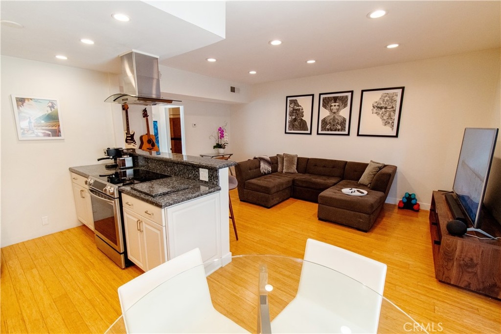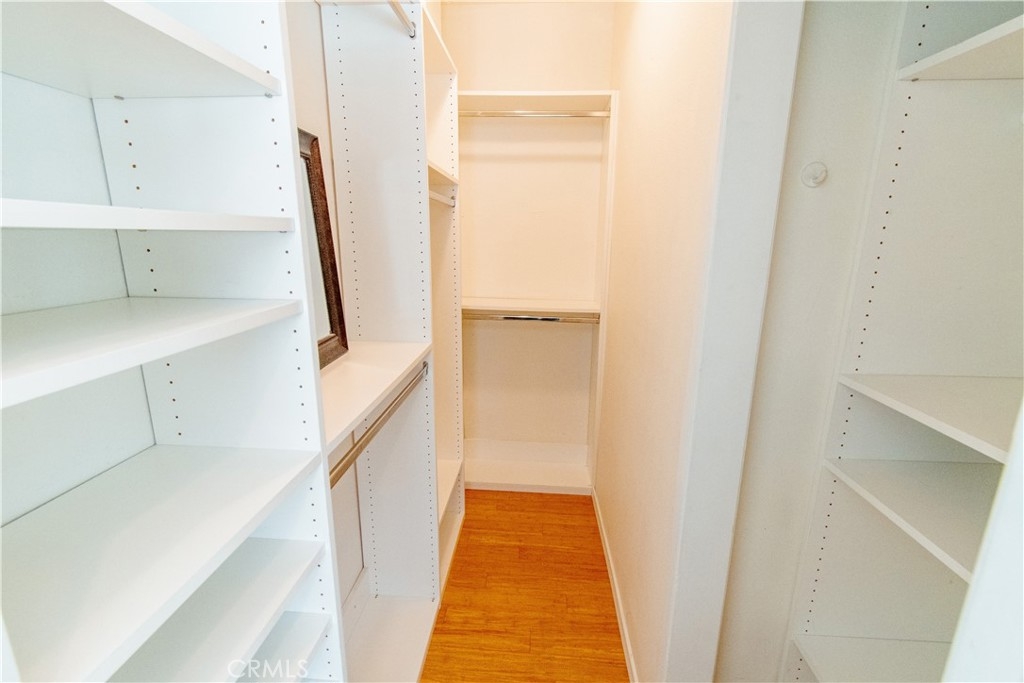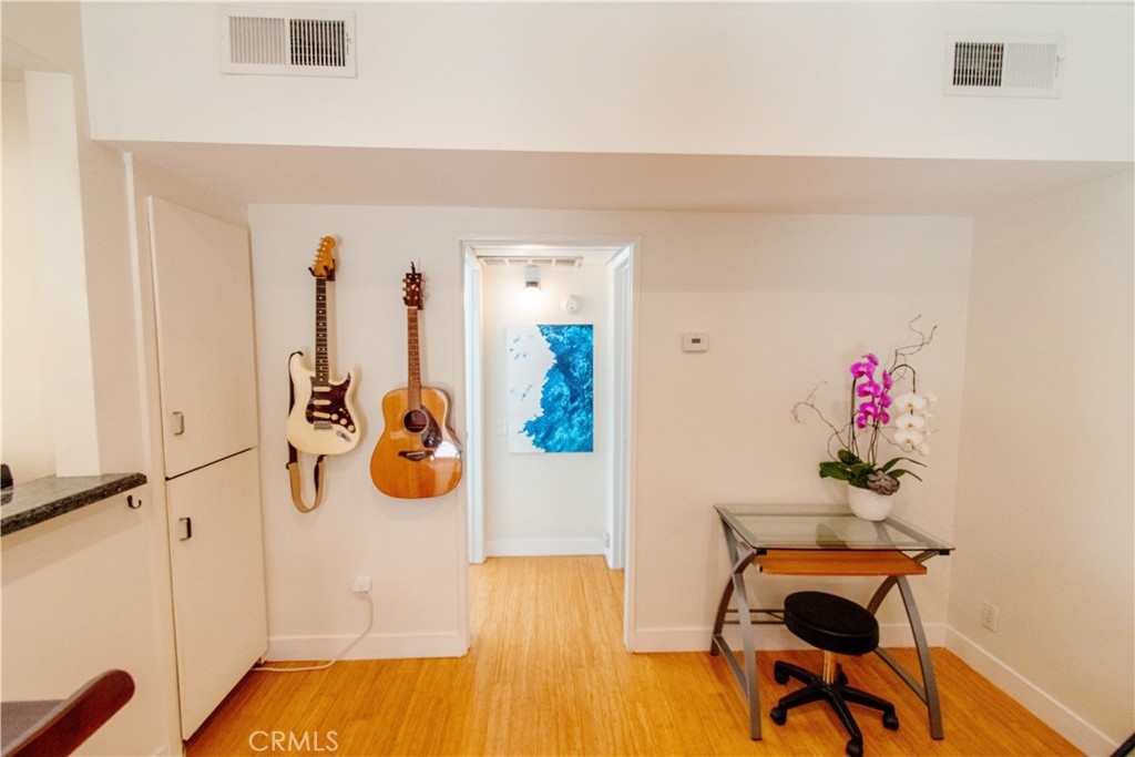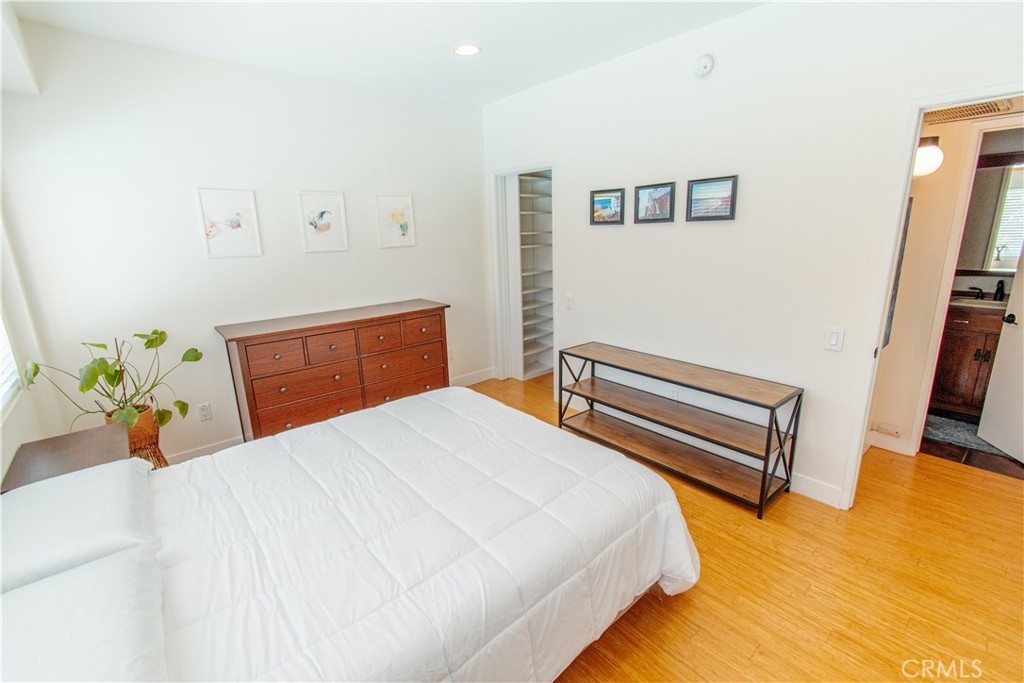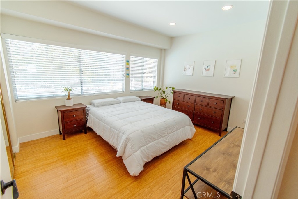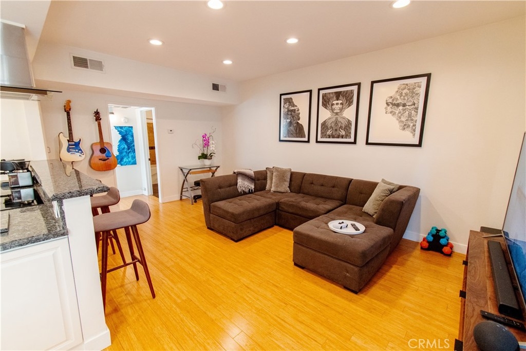 Unparalleled Opportunity to live in Brentwood! This corner unit has a well laid out floor plan with only one shared wall and bamboo floors throughout. Updated open kitchen with granite countertops, glass tile backsplash, Stainless steel appliances, and breakfast bar. Sweeping sunlight from west facing bedroom windows, sliding glass door, and recessed lights throughout. Your private patio has direct access t your lounging pool and hot tub. Spacious master suite has 2 built out closets with modular organization, including a walk in closet, which isa rear find! Central heating and cooling, energy efficient tankless water heater. The spa inspired bathroom has beautiful stone tile and wood details with a large tub and separate stand alone tile shower. Other amenities include a gym, sauna, and on-site manager / maintenance person. Low HOA fee includes water and EQ insurance. Extremely well maintained building with beautiful lobby entrance. The unit includes one parking spot ina secured parking garage and guest parking. Enjoy everything the neighborhood has to offer; just steps away from tennis courts, acclaimed eateries and shops, the farmers market and more! Definitely The Best That Brentwood Has To Offer!