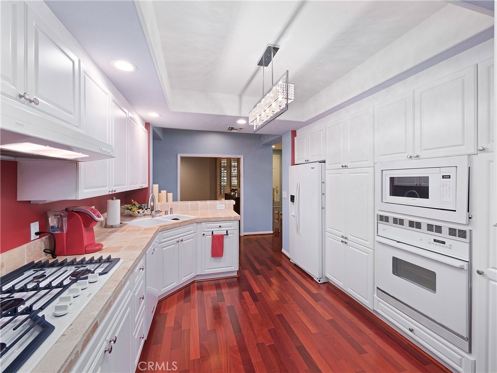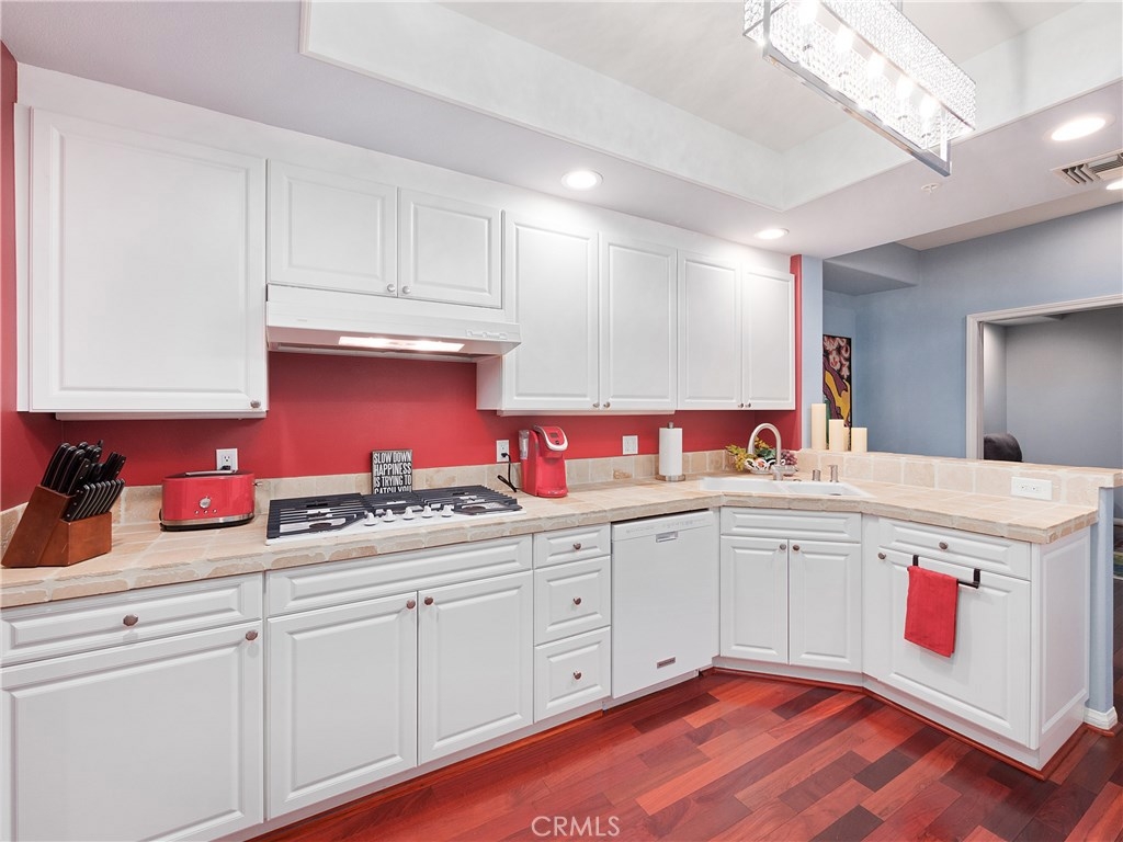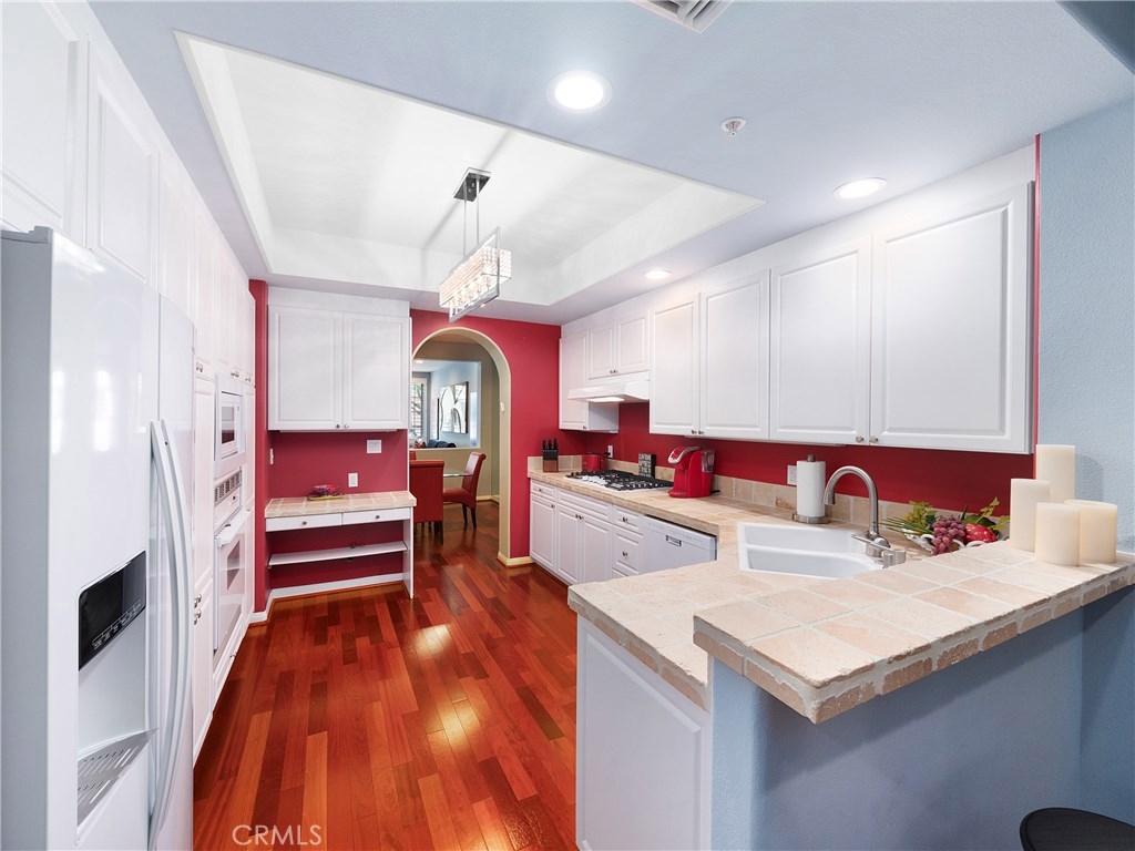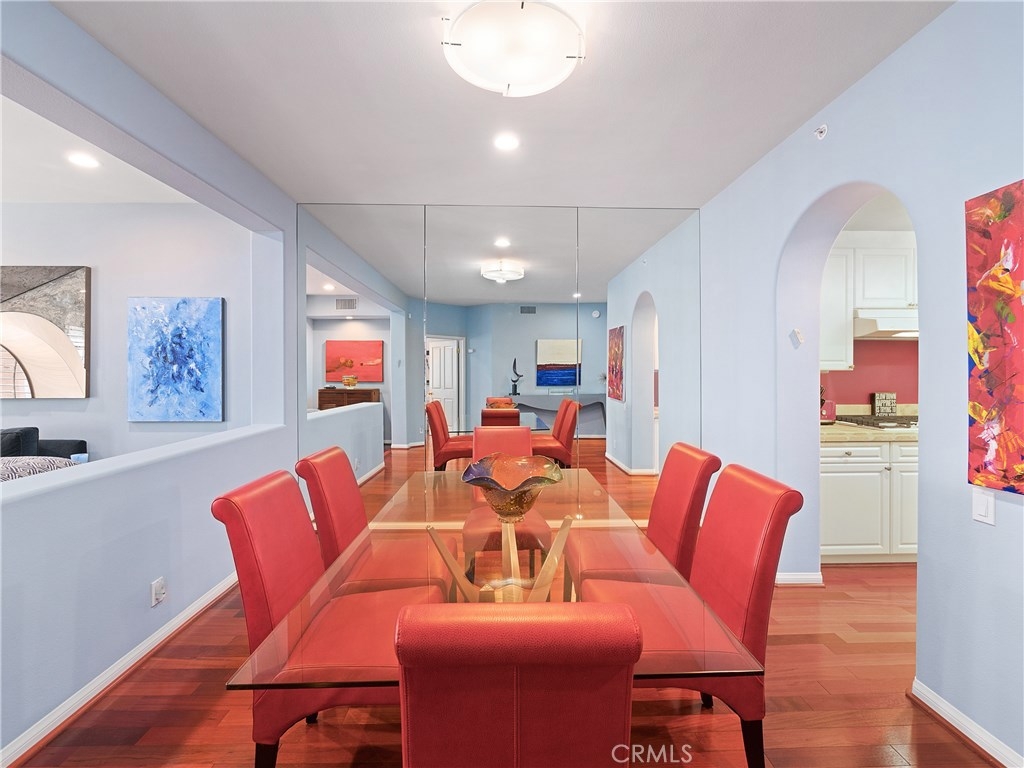 Designer dreams and esthetic goals. A condo so spacious it feels like home. Enter this modern tuscan abode and you're greeted with sparkling wood flooring throughout the unit. The wide entry corridor lures you to the kitchen boasting new appliances, ceramic tile countertops, and copious white wood cabinetry. The kitchen conveniently features a private extra room- perfect for an office, media room, or another bedroom. Adjacent to the kitchen is the spectacular newly mirrored dining room illuminating the area and enlarging the room. The plush modern living room is bright with natural light, yet still warm with the cozy fireplace. The oversized master bedroom is complete with designer wallpaper, walk in closets, master bathroom with dual sinks and stunning bath and shower. Another guest bedroom features a convenient office nook and a private bathroom. This unit has been recently updated with new recessed lighting, plantation shutters throughout, electrical wiring, designer wallpaper, new toilets and appliances. Conveniently located in the heart of Brentwood- a stone's throw for all the shopping, dining, and attractions of this glamorous city. Your new home glamorously awaits.