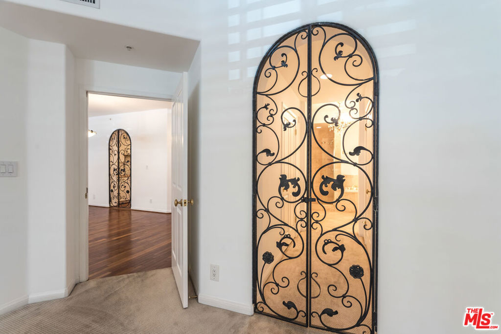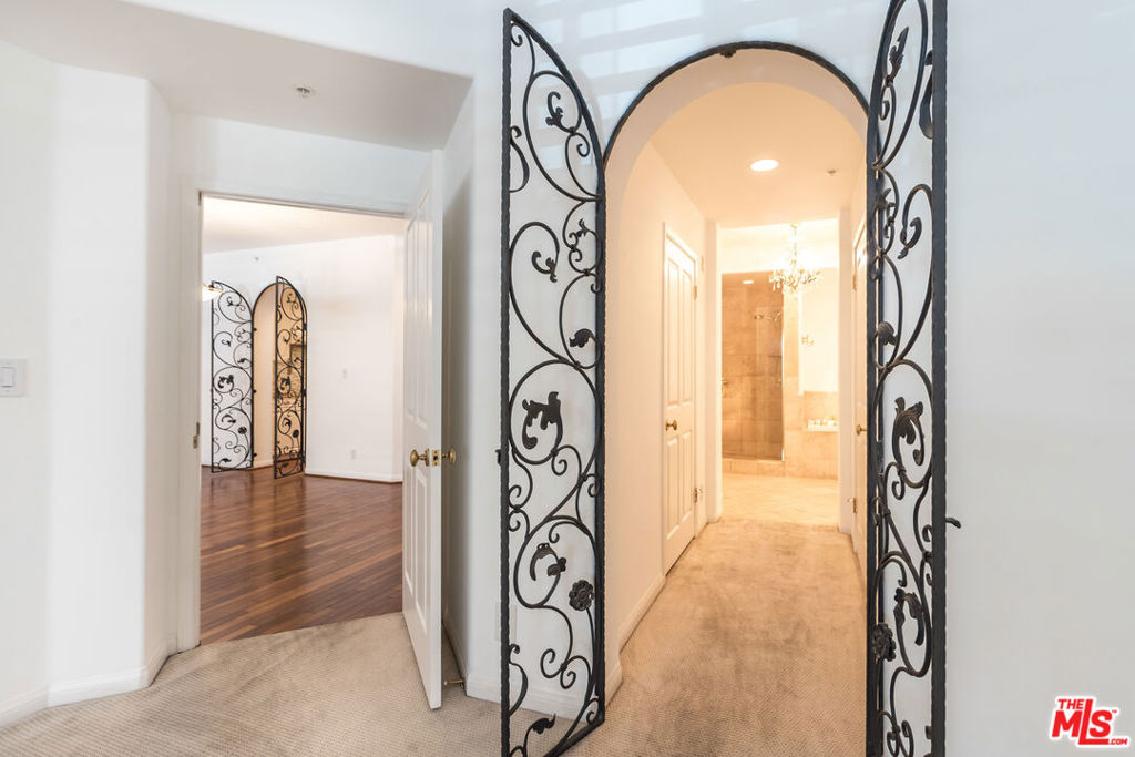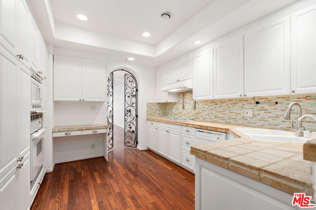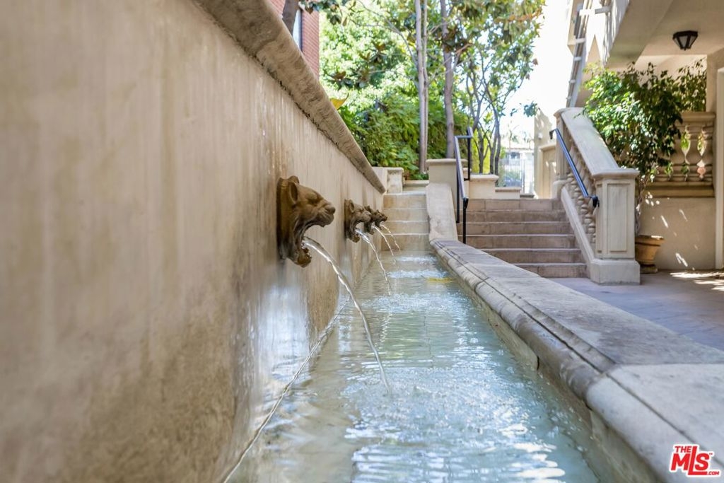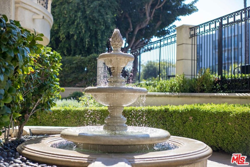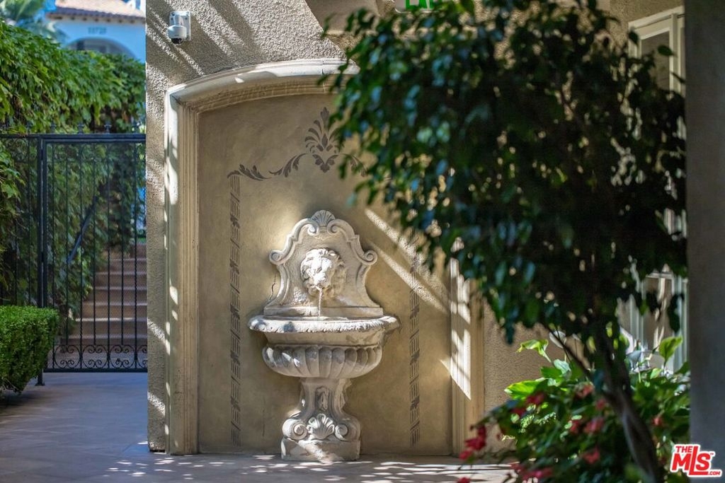 Bright, spacious, immaculate, luxury ground floor condo located in prime Brentwood neighborhood, one block from shops and restaurants. Open layout and great flow, beautifully detailed with high ceilings, gallery walls, hardwood floors, arched doorways with wrought iron gates, stone fireplace, gorgeous tile work, and a wall of floor-to-ceiling shelves. In-unit laundry, two parking spaces in garage. Building is beautifully maintained, with lovely gardens, fountains, gym, and rooftop swimming pool.