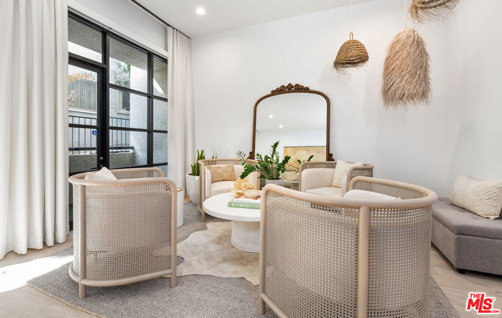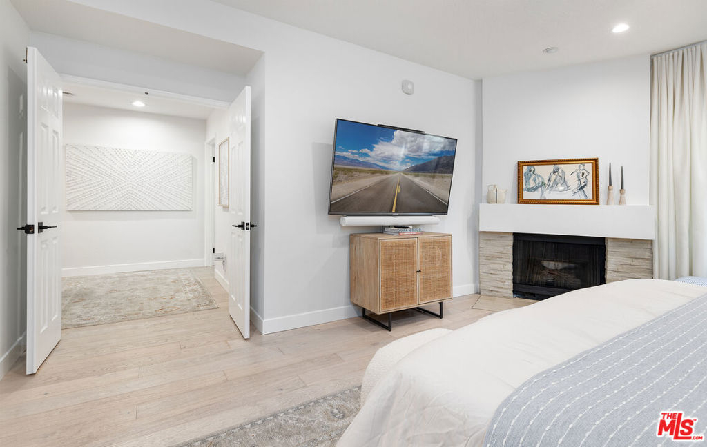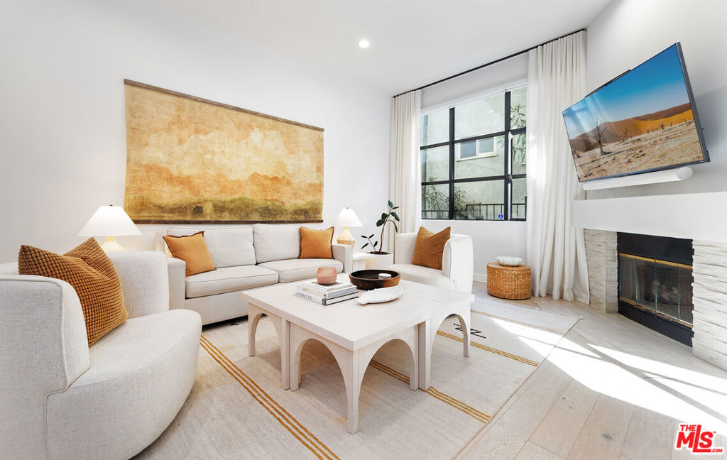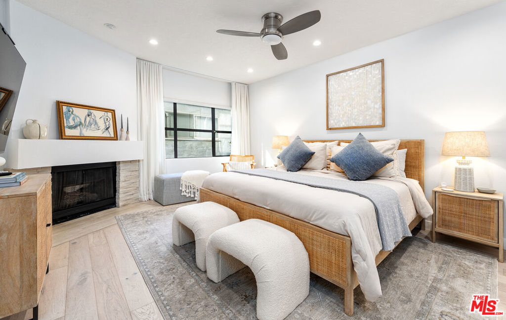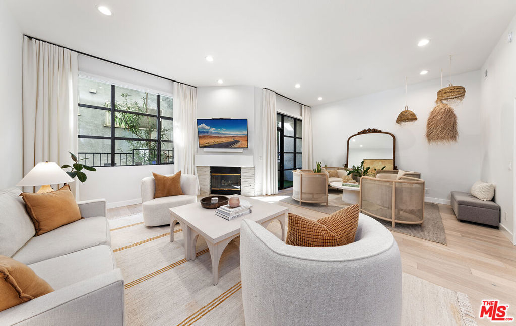 Experience the ultimate in style and comfort with this newly designed townhouse-style condo in a prime Brentwood location. Upon entry, you'll be greeted by an impressive foyer leading to an open living and dining space with soaring ceilings, a decorative fireplace, and a sleek bar area. Wide-plank flooring, bright walls, and stunning contemporary fixtures enhance the sophisticated vibe. The kitchen is a masterpiece with custom cabinetry, high-end stainless steel appliances, and a serene garden planter view overlooking the pool. The primary suite offers a tranquil escape, featuring a decorative fireplace, a dressing area, and a spa-inspired bath with double sinks, a floating tub, and a luxurious shower. Upstairs, a second light-filled bedroom and a chic modern bathroom complete the space. Additional perks include a stylish laundry room, two individual parking spots, and extra custom storage. Residents can also enjoy the courtyard pool, spa, and guest parking.