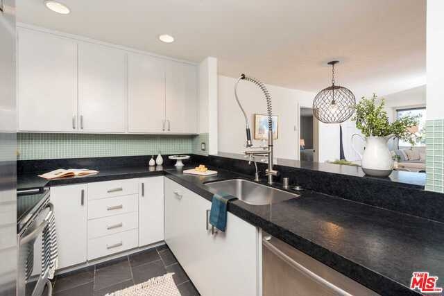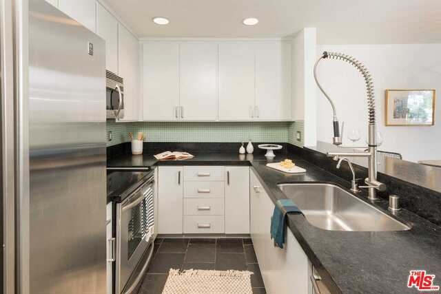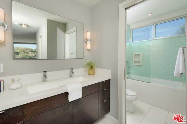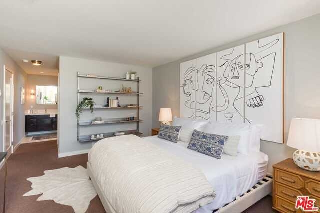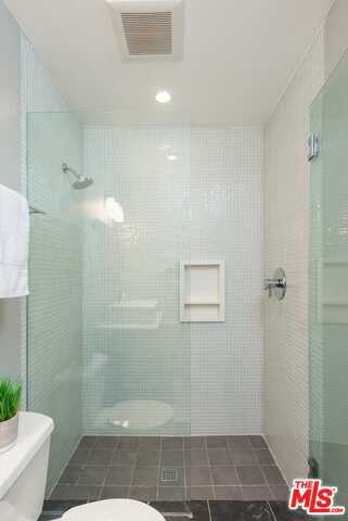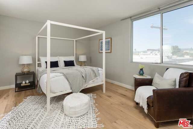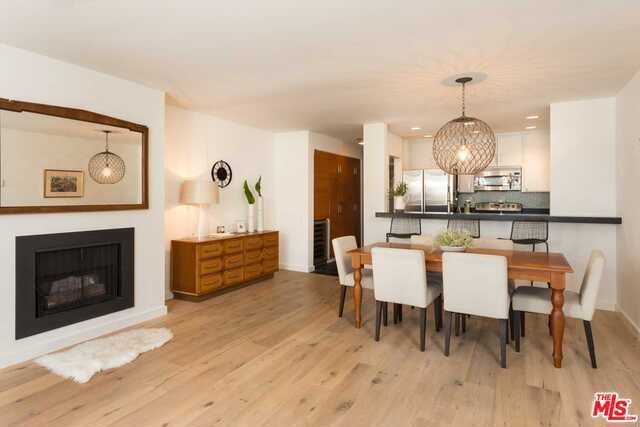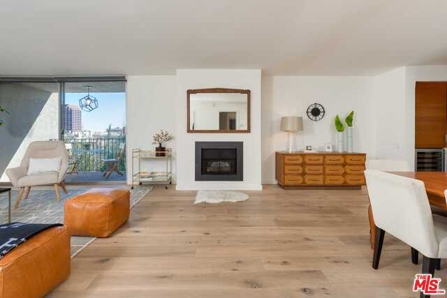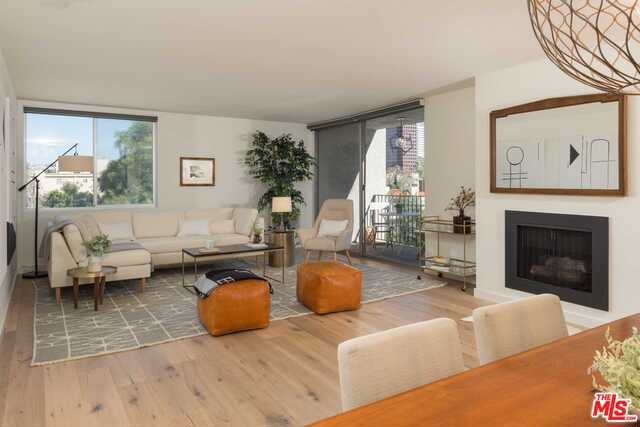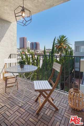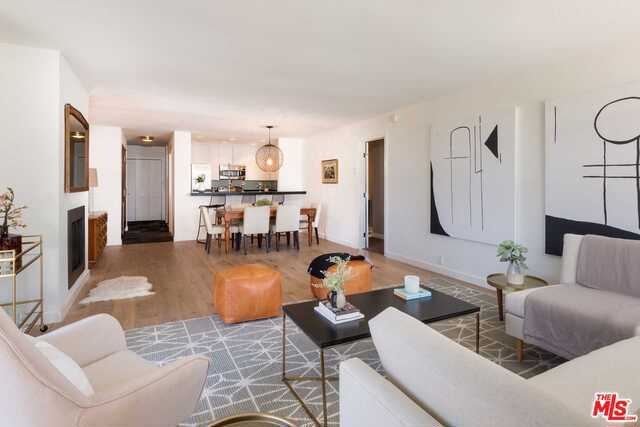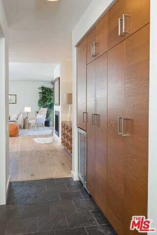 Top-floor, single-story, corner residence in a fantastic location close to shops and restaurants on San Vicente and Wilshire. Open concept floor plan, perfect for entertaining, with light-infused living and dining areas, which extends to a private balcony with beautiful tree top views. The spacious master suite is equipped with an en-suite dual vanity bathroom and walk-in closet. Down the main hallway, past the laundry room, is a well-appointed guest bedroom separate from the living area. Hardwood floors, living room fireplace, built-in wine fridge, stainless steel appliances, and an updated kitchen make this turn-key residence a must see in the heart of Brentwood.