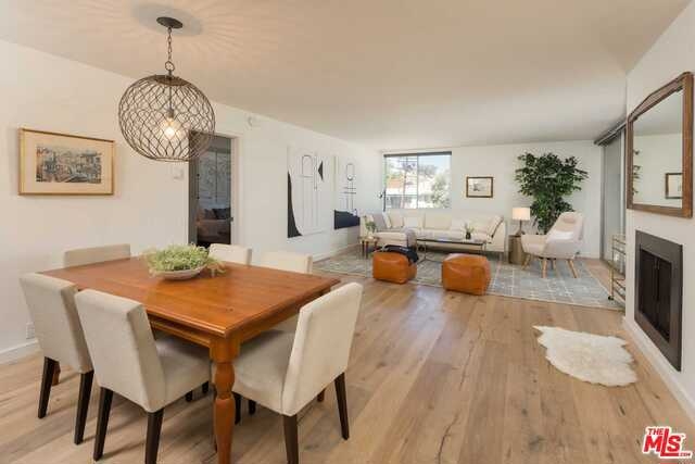 Top-floor, single-story, corner residence in a fantastic location close to shops and restaurants on San Vicente and Wilshire. Open concept floor plan, perfect for entertaining, with light-infused living and dining areas, which extends to a private balcony with beautiful tree top views. The spacious master suite is equipped with an en-suite dual vanity bathroom and walk-in closet. Down the main hallway, past the laundry room, is a well-appointed guest bedroom separate from the living area. Hardwood floors, living room fireplace, built-in wine fridge, stainless steel appliances, and an updated kitchen make this turn-key residence a must see in the heart of Brentwood.