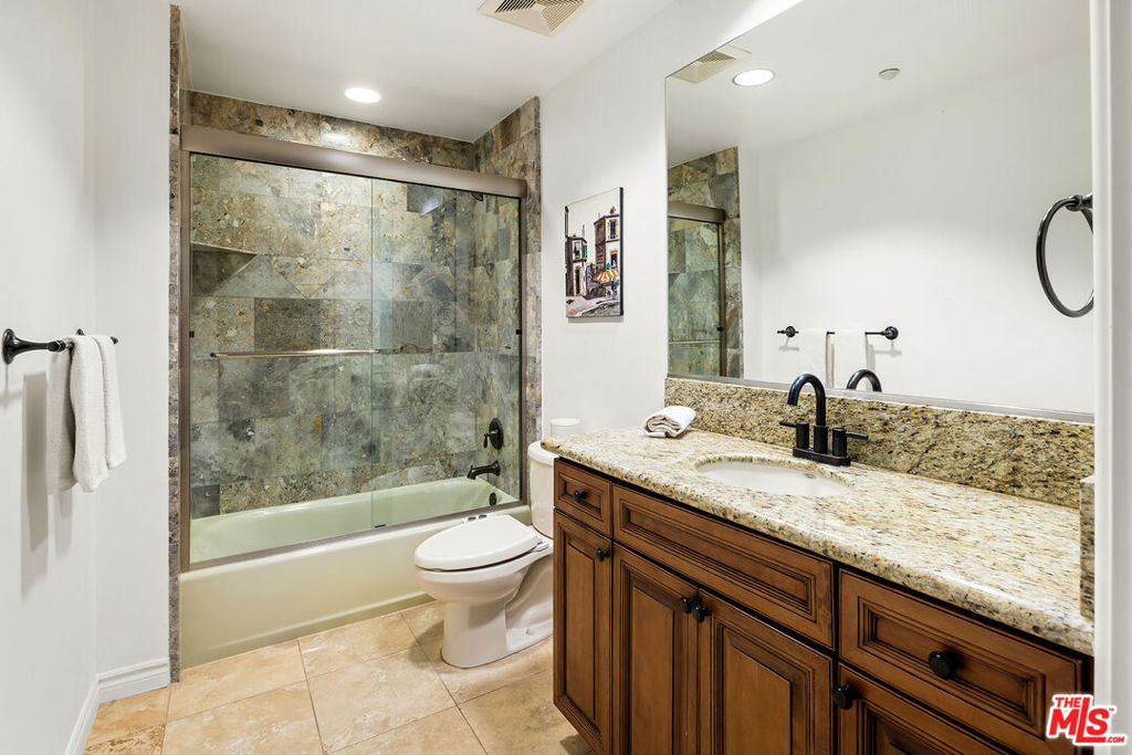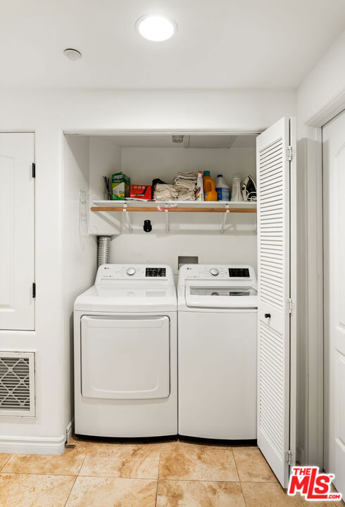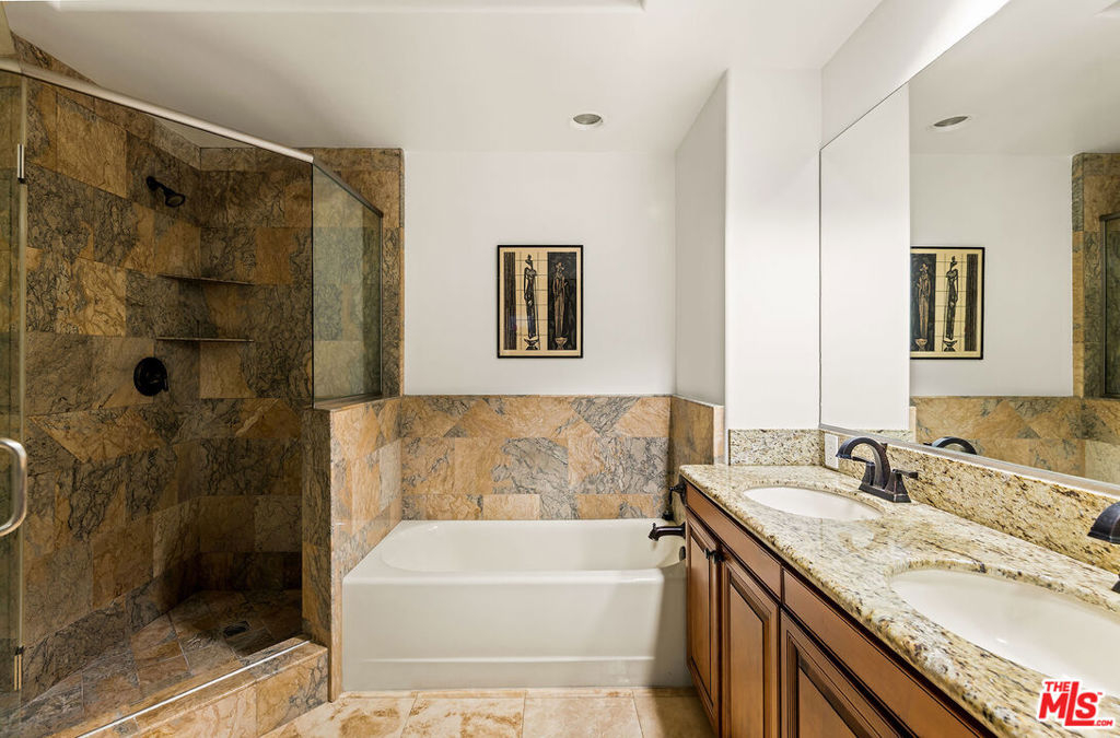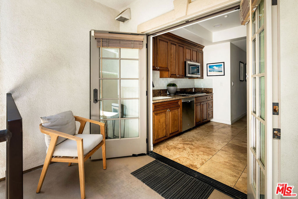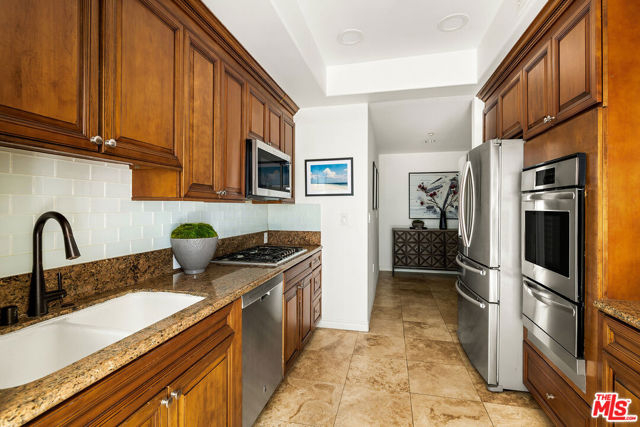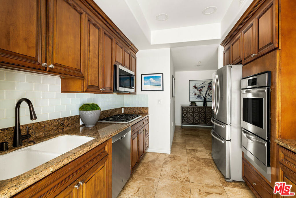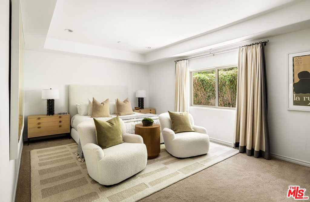 Located on one of Brentwood's most charming tree-lined streets, this 2-bedroom, 2.5-bath condo offers a rare blend of privacy, space, and prime Westside living. Elevated above street level with no neighbors below, the unit features direct entry through a private side patio, providing a unique sense of seclusion and ease. The open-concept layout spans approximately 1,500 square feet and features high ceilings, travertine floors, and a generous living area with plenty of space to relax or entertain. The kitchen is outfitted with stainless steel appliances, oak cabinetry, and ample storage, with room for a breakfast nook and access to the side patio. The spacious primary suite includes a walk-in closet and an en suite bathroom with dual vanities, a soaking tub, and a separate shower. A second bedroom with its own en suite bath offers flexibility for guests or a home office. A separate laundry room with side-by-side washer and dryer adds everyday convenience. Additional highlights include central HVAC, a gas fireplace, and two tandem parking spaces in a secure, gated garage with available EV charging. Set in a quiet, 11-unit building, this home blends the comfort of residential living with close proximity to San Vicente's top restaurants, cafes, parks, and the beloved Brentwood Farmers Market.