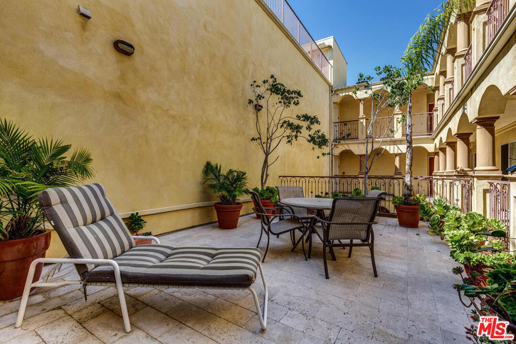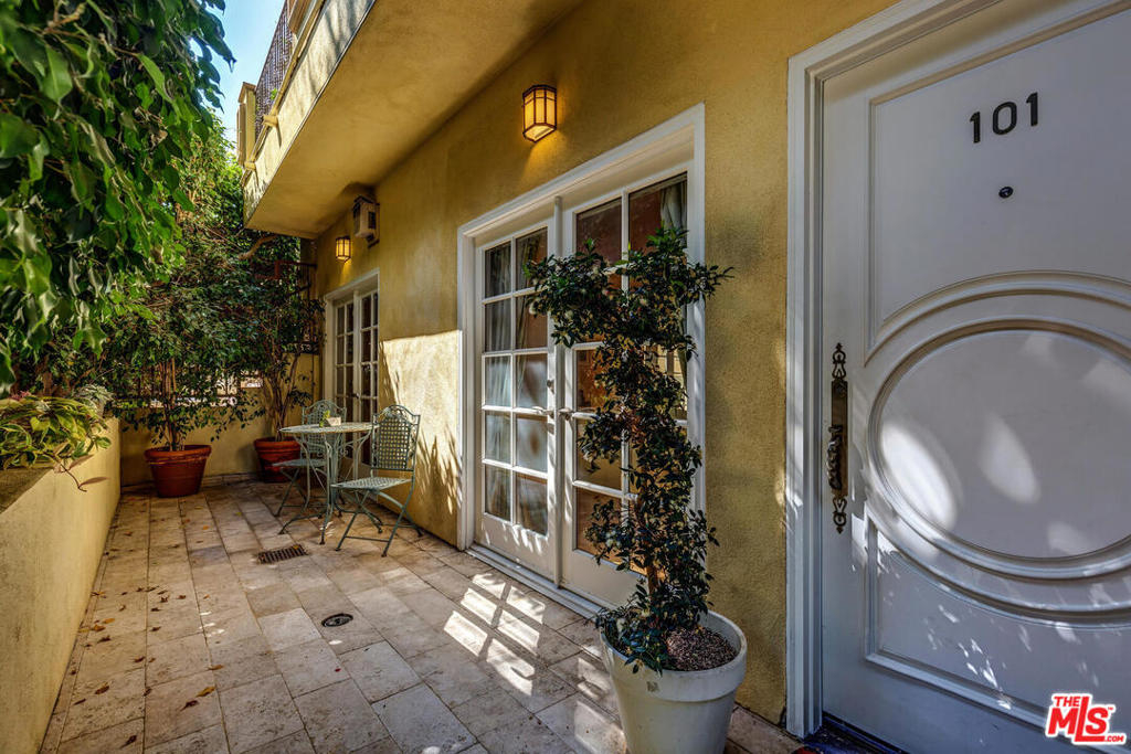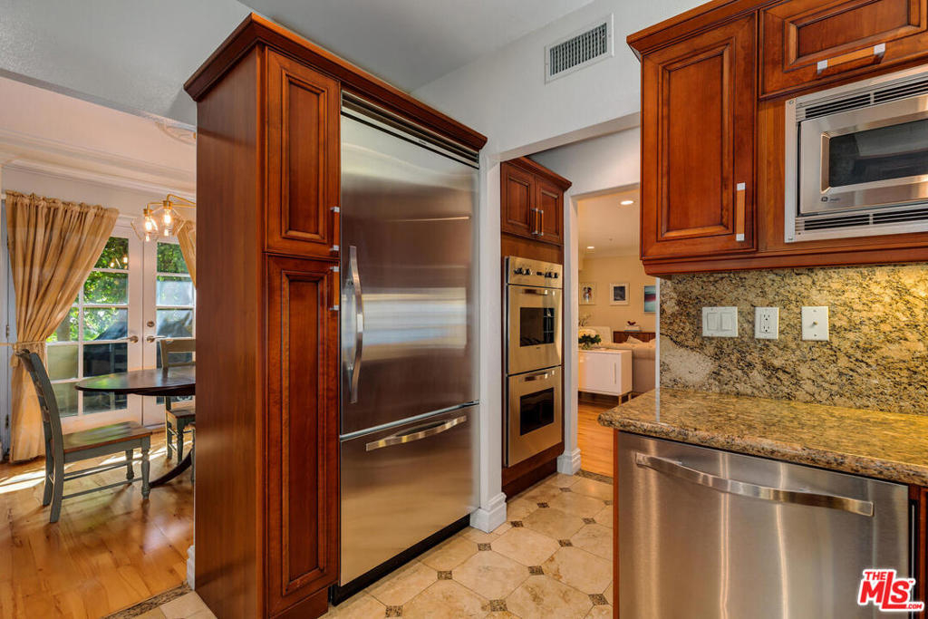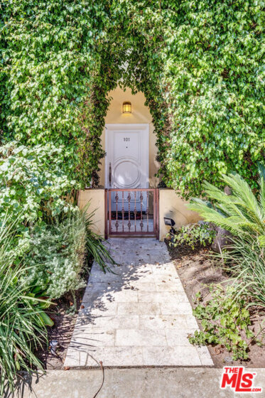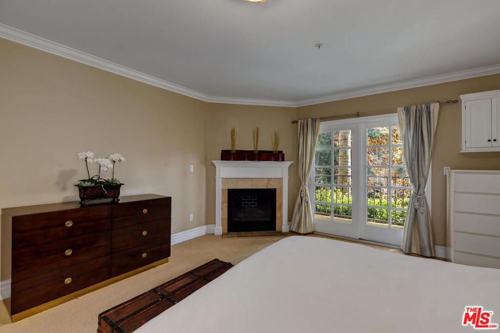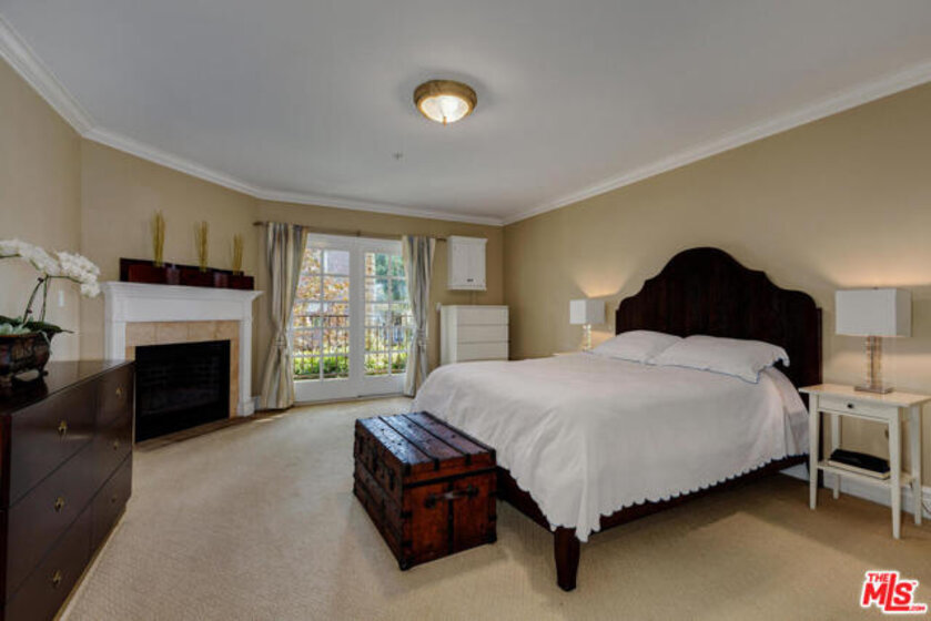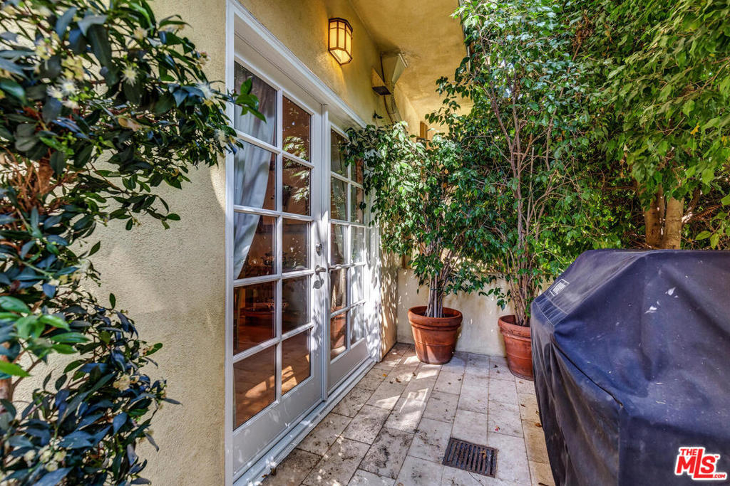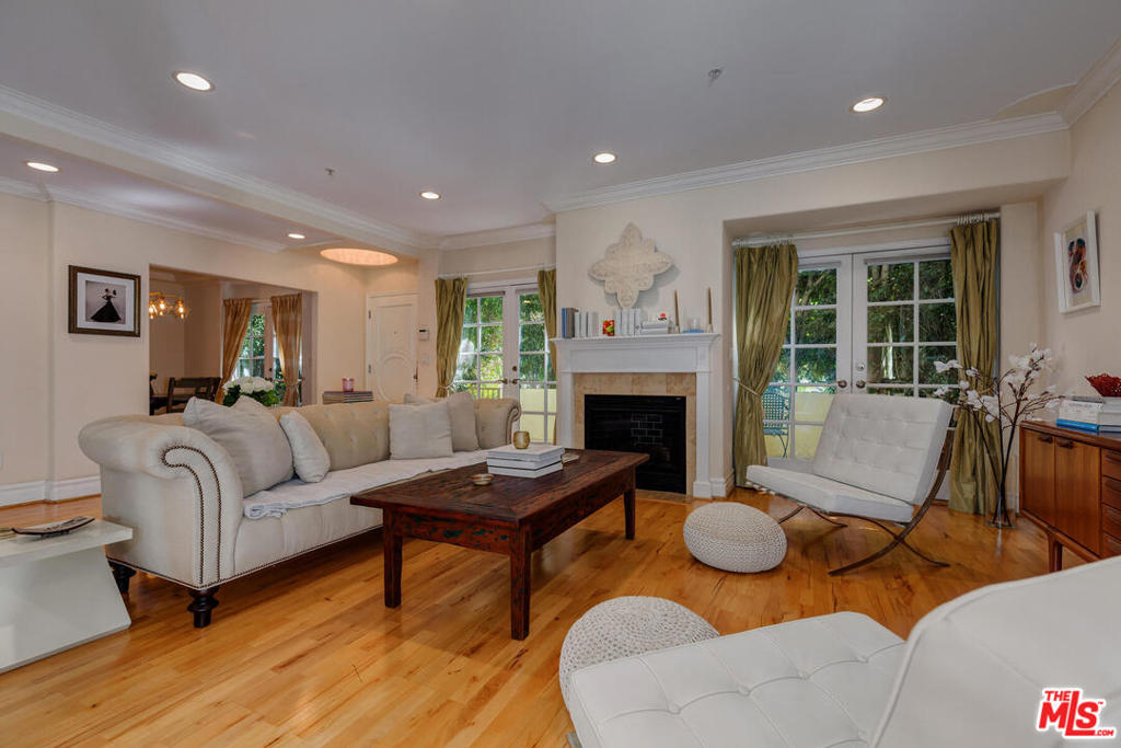 Spectacular and spacious townhome that features a separate entrance that feels more like a private home. Lucious greenery surrounds this 2-story townhome. From the front door you enter into a great, open living area with a mantel fireplace. French Doors lead to private patios and let in an abundance of light. A Gourmet Kitchen has Viking appliances and wonderful Italian granite countertops. A separate dining room is perfect for intimate dinner parties, or open the French Doors for al fresco entertaining. Two wonderfully large bedrooms on the main level have their own private patios and sliding doors that let in beams of light. Powder room for guests. And a full bath is reserved for the two bedrooms. Upstairs is the Master Suite retreat complete with a fireplace, walk-in closet and ensuite spa bath with separate shower and sunken tub. All this and direct access to your own secured parking right outside your back door. Gym too. Just minutes to all of Brentwood, Santa Monica.