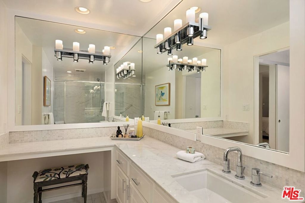 Exceptional offering in The Brentwood House. This beautifully maintained and updated front-facing 2bedroom + 2bath bright corner condominium has neutral dcor and offers great attention to detail and presentation. Freshly painted, lovely wood floors and newly carpeted bedrooms. The open floor plan/great room with living room and FP, dining and kitchen is bathed in sunshine and has an adjacent dining/cocktail terrace for warm summer evenings. The master suite is exceptionally large with a generous walk-in closet and well-designed bathroom with large marble shower, generous marble countertop and makeup area. The secondary bedroom is good-sized with a wall of closets and can be used as both bedroom and is large enough to provide an at-home desk/office area. In-unit laundry, side-by-side parking, guest parking and large private storage shared with one other homeowner. Pool, Spa, EQ Insurance, guest parking and excellent Management Company. Many believe the building location is the BEST of all locations in Brentwood. Across the street is the Sunday Farmers Market, in front is the San Vicente grass jogging median lined with Coral trees, moments away are grocery stores, great restaurants like Pizzana and Baltaire and shops galore. A welcome respite to be able to walk to all or a short bike ride to the Santa Monica bluff and the ocean beyond.