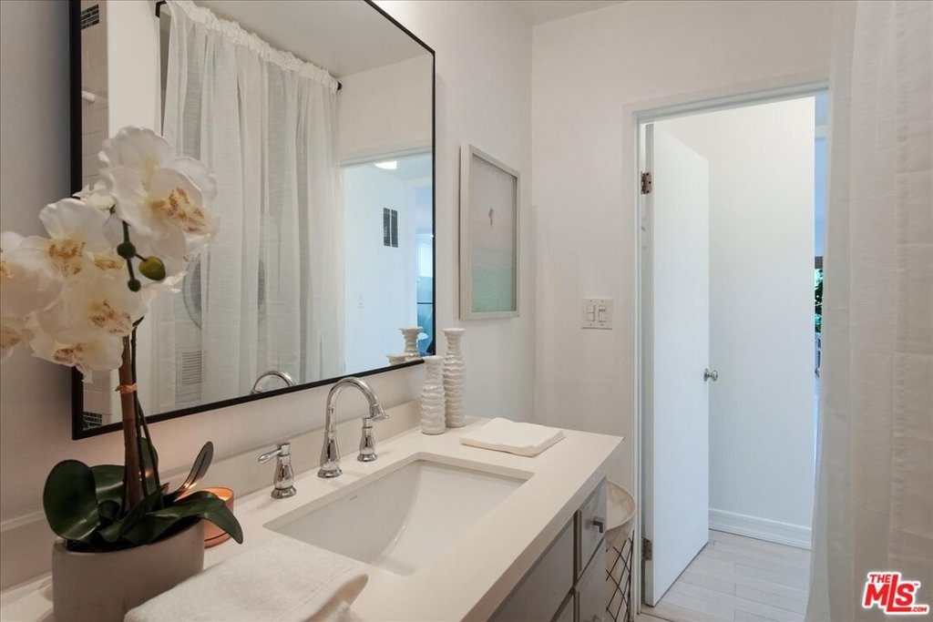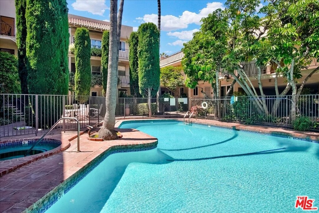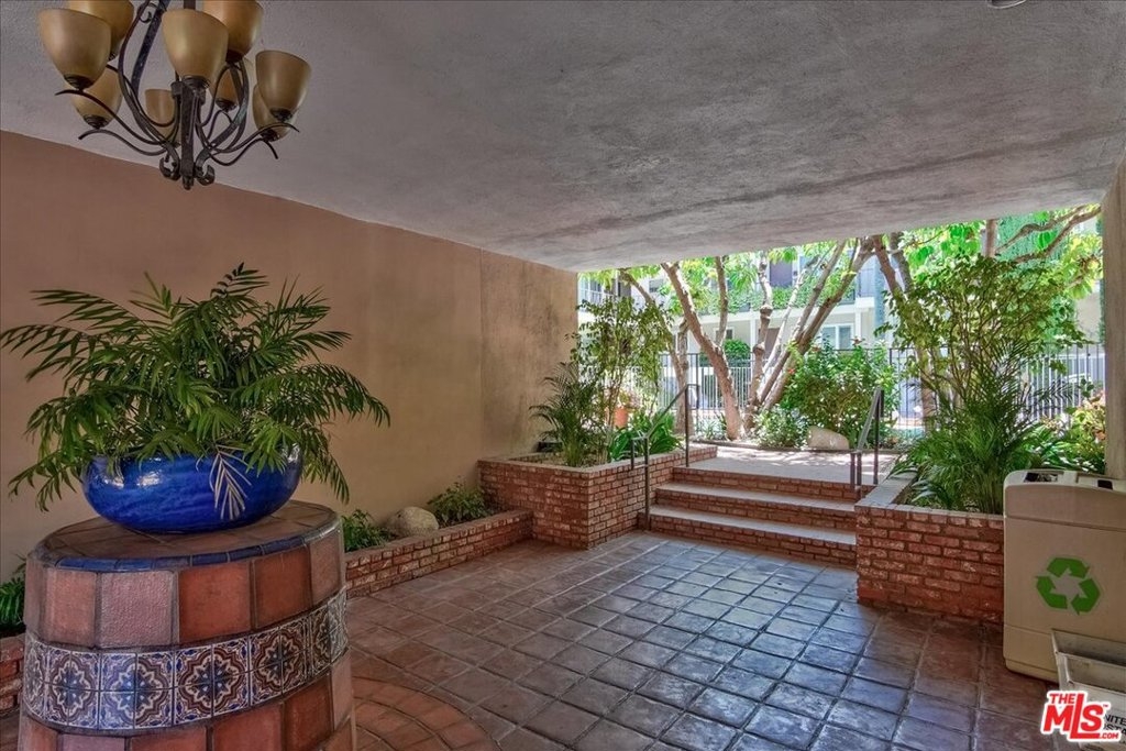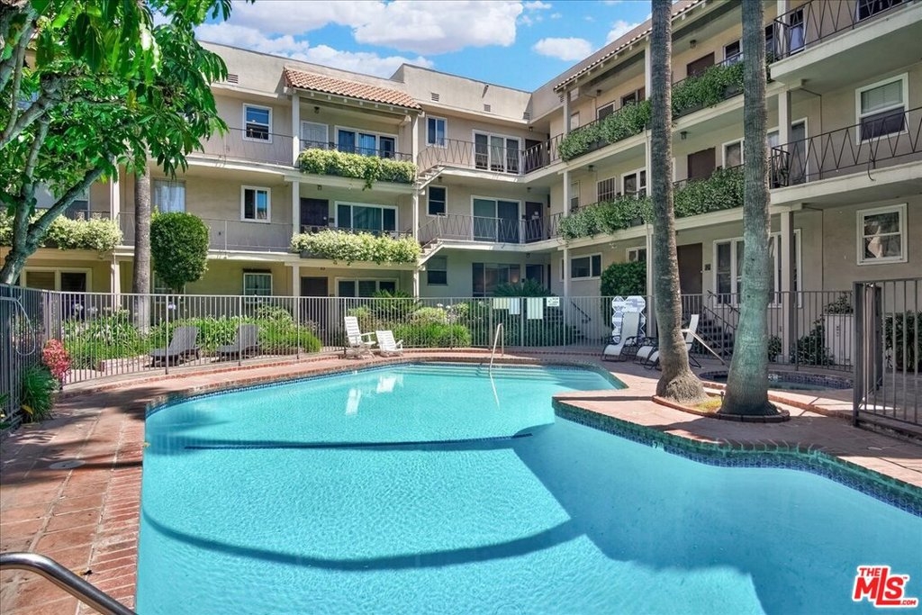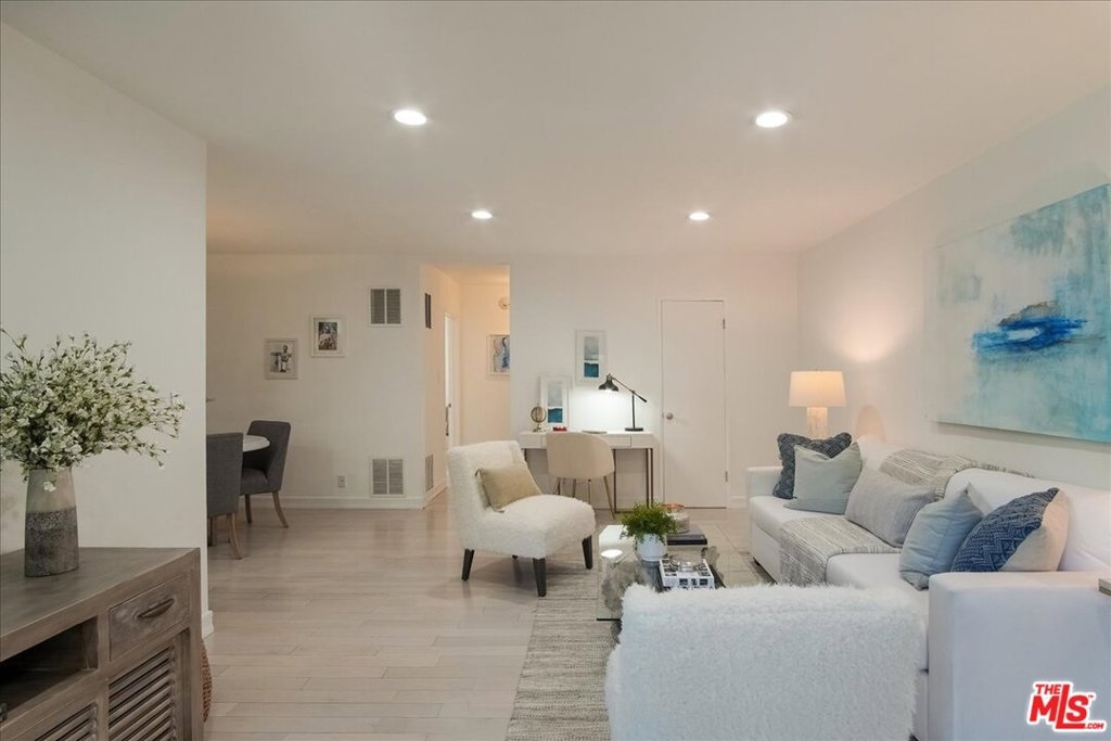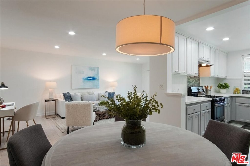 CHIC & STYLISH, large 1 bedroom, 1 bath, on one level, end unit! Recently remodeled with white quartz counter tops - newer cabinetry - stainless steel appliances, freshly painted throughout, new LED recessed lighting, whitewashed oak hardwood floors throughout, custom blinds, designer tile in kitchen and bathroom, stacked washer/dryer in unit with abundant closets (4 in total) - room for office/desk off living room and formal dining area. This charming complex has large community swimming pool and lounge area, perfect for summer time relaxation. Convenient location near Brentwood/Barrington shopping, Post Office, restaurants, Dog Park, 405 frwy. and more! One car covered parking - low HOA dues.