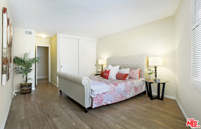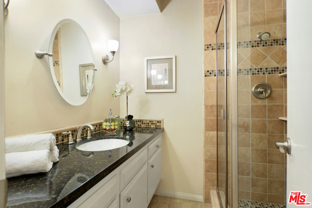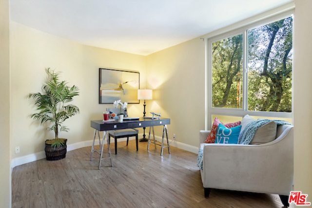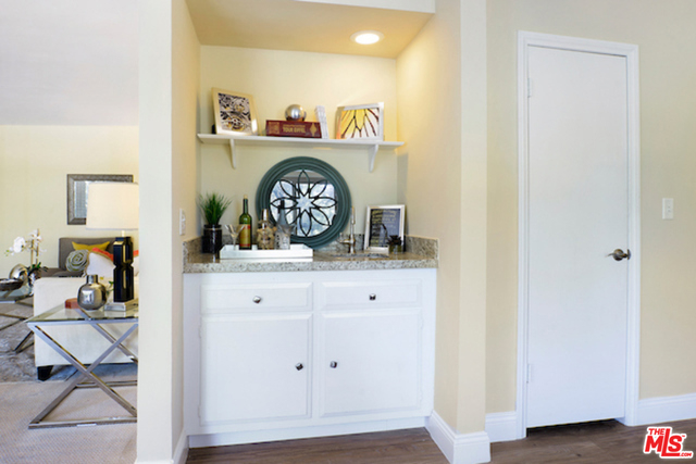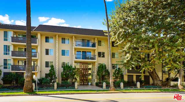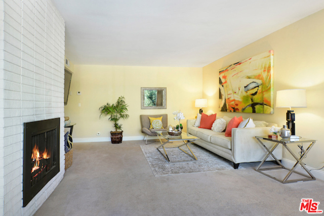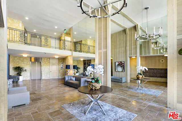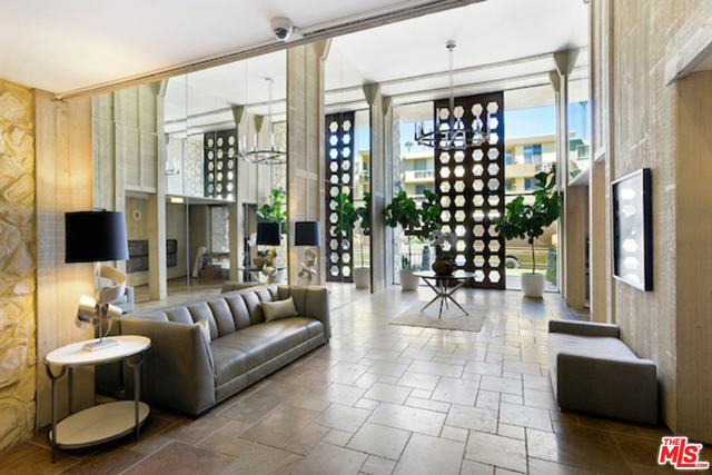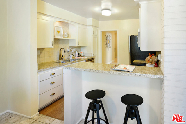 This magnificently updated, single-level mid-century residence features two bedrooms, two bathrooms, and a den/office - all in a recently renovated building in the heart of Brentwood. The stately entry hallway leads to an ideal layout with bedrooms on opposite sides for more privacy. The living room features a gas fireplace, mounted flat screen TV, separate den/office space with wet bar and walk-in closet, and sliding glass doors leading to a private balcony. The dining area has plantation shutters and a granite-topped breakfast bar. The kitchen has stainless steel appliances, upgraded granite countertops, and a stone back splash. The spacious master suite offers ample closet space and built-ins. The recently updated master bath features tumbled limestone and a glass enclosed shower. Two tandem parking spaces with a separate storage space. Smartly remodeled hallways lead from the impressive two-story vaulted entrance and lobby. HOA dues include EQ Ins, Water, Gas, Trash and Cable TV.