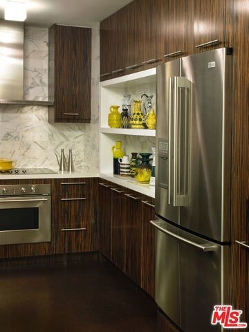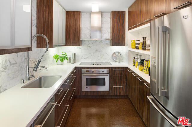 Reminiscent of The Parker Hotel, this chic and sophisticated home has been extensively remodeled with no expense spared. This immense one-bedroom condominium rivals many two-bedrooms in square footage and seamless design. Featuring an open floor plan that is perfect for entertaining or a cozy night in. Stunning chef's kitchen with quartz countertops and stainless steel appliances. Expansive dining area with wet bar, wine refrigerator and built-ins. Great closet space throughout, private balcony, and two side-by-side parking spaces. The building features a grand lobby with vaulted ceilings, gym, saltwater pool and spa. Enjoy the good life right in the heart of Brentwood near shopping, dining, and the Sunday Farmers Market.