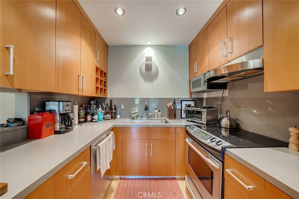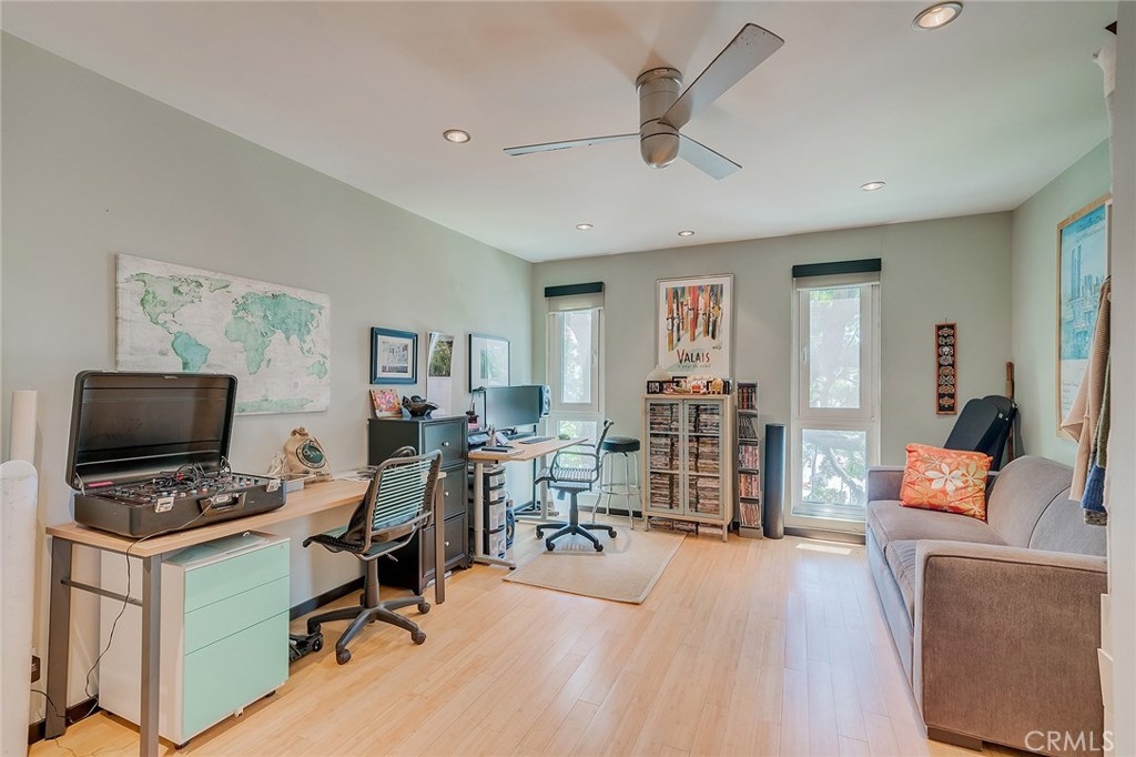 On the corner of one of the most sought after neighborhoods in all of Los Angeles sits this light-filled gem you won't want to miss out on. The walk-ability from this double en-suite haven is truly second to none. When you walk through the front door, you immediately sense the welcoming and open living space that is so thoughtfully laid out. The living and dining room proximity is perfect for winding down after having just cooked a gourmet meal in your updated chef's kitchen. If you're a movie buff or love watching sports on a big screen, the main wall is perfectly situated for a large projection screen. Lucky for you, the surround sound is already wired. So, sit back, relax, and enjoy the comforts of your new home. Recessed lighting throughout really showcases all the beauty this unit possesses. Additionally, accent lighting is perfectly placed around the condo for those who love to showcase their finest pieces of art. With the option to make either bedroom the master, this home truly presents a ton of possibilities for anyone looking to capitalize on a home that won't last long. Finding "home" is more important than ever, so don't miss out on calling this one yours!