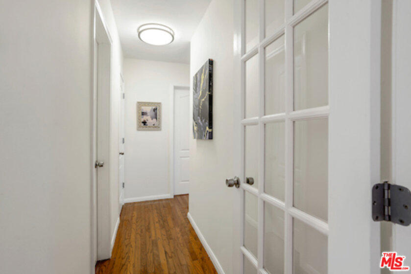 Prime Location in Brentwood. Bright front facing unit w/ hardwood floors throughout w/ beautiful greenery & treetop vistas creating privacy. Well-laid out floor plan w/ double pane windows. Stunningly remodeled kitchen with S/S appliances, quartz countertops w/breakfast bar and recessed lights. Tons of counter & cupboard space. Spacious living room w/an attractive electric fireplace & surround sound speakers. Good size dining room accented by drop lights, private balcony surrounded by trees. There is a wet bar w/quartz counters and win fridge. Redone tiled bathrooms, generous size 2nd bedroom w/ sitting area. Master suite w/ sitting area & walkin closet. Custom window shades in bedrooms & dining room. Installation of washer/dryer in unit w/ HOA approval. 2 car side by side security parking w/EV chargers available throughout. Homeowners dues include water & EQ Insurance. Amenities include a pool, spa, sauna. Close to the quaint shops & cafes of Brentwood Village & Barrington Rec Center.