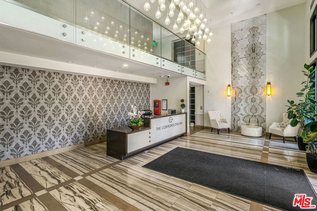 Welcome to The Cosmopolitan BW, one of the only full-service buildings in the heart of Brentwood. This luxurious, newer construction condo is located on the top floor and features oak wood floors, high ceilings and oversized windows. The open concept kitchen, living and dining spaces all share views of trees, the city and even the ocean. The kitchen is equipped with Italian cabinetry, Italian tile, quartz counters and stainless steel appliances including a high-end Wolf range. All three bedrooms are generous in size and have ample closet space. The primary and secondary bedrooms feature en suite bathrooms with walk-in closets. Additionally, unit 406 has a balcony off of the dining area, an in-unit washer/dryer, central A/C, ample storage, and two parking spaces (tandem). The building amenities include a 24/7 concierge, fitness center, pool, EQ insurance and guest parking.