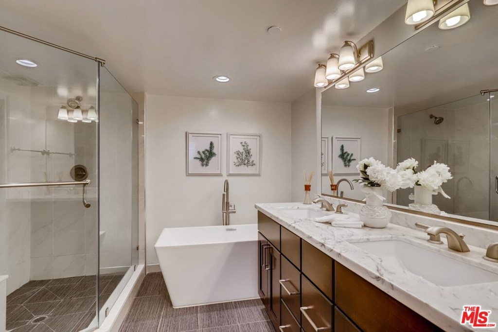 Light and bright in a secure/gated building, this new-to-market 2 Bedroom/2.5 Bathroom wont last long. Just remodeled with brand new white-oak engineered floors and fresh paint, this rare 1-level Brentwood condo features a spacious great room with fireplace & patio, lovely powder room, large eat-in kitchen with granite countertops, stainless-steel appliances and in-unit laundry. Both bedrooms are en-suite with luxury bathrooms, one with a walk-in closet. Recessed lighting and plantation shutters throughout. Incredibly convenient for walking to Brentwood's shopping, dining, & attractions. Amazing location in the heart of Brentwood. More pictures and 3D-Tour available post-staging.