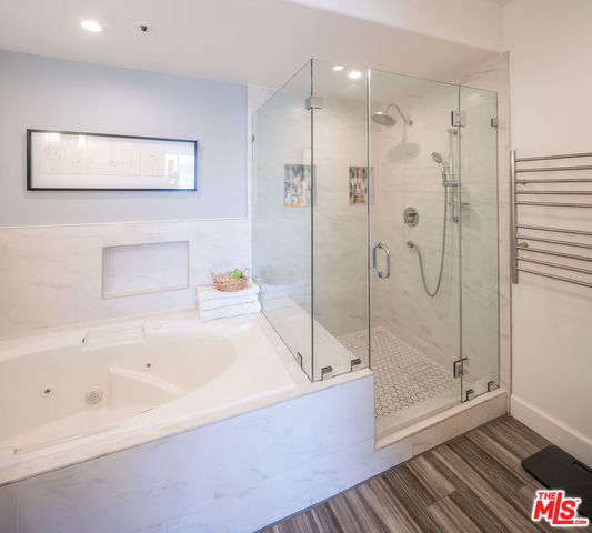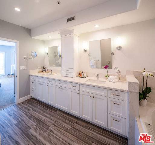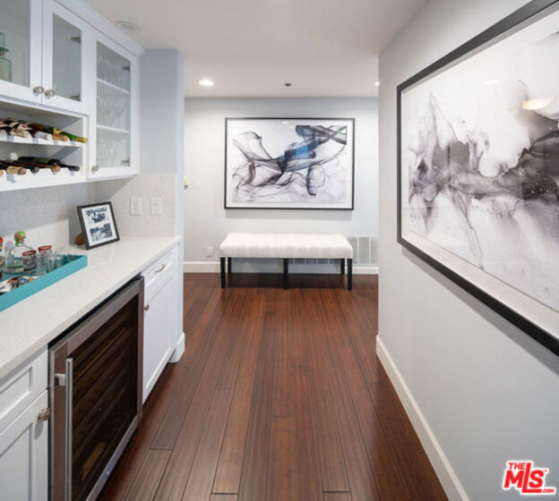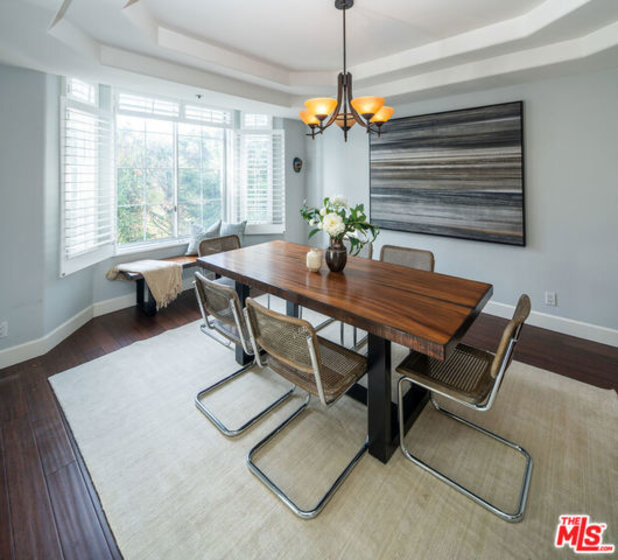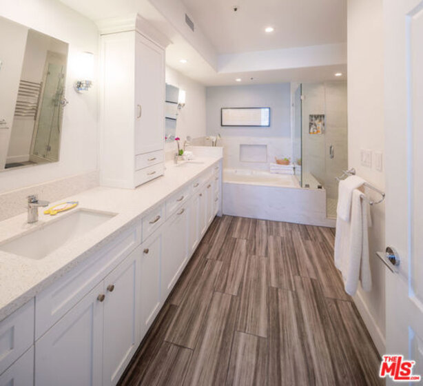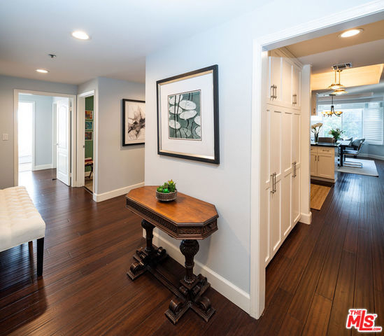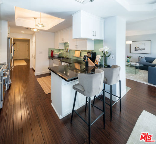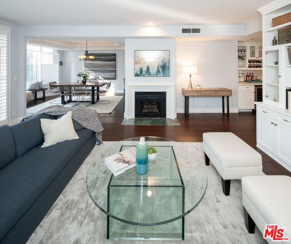 Rare opportunity to own a beautiful and large single-level upper level unit in one of the most amenity-rich buildings in Brentwood, the Excelsior! West facing corner unit home is perfectly situated within the building for maximum quiet, privacy and stunning views! Recently renovated with gleaming hardwood floors in the living areas and clean modern details throughout. Kitchen features top of the line fixtures, stainless steel appliances, quartz countertops and custom cabinetry. Spacious dining/living areas enjoy incredible natural light and open to two outdoor patios. The significant master suite features a fireplace, large walk-in closet, ensuite bathroom with double sink, shower, soaking tub, maple cabinetry and porcelain tile floors. Other custom features include built in bar, two wine fridges, entertainment unit, inside laundry room, and two sxs parking spots with ample storage cabinets. Building amenities include pool, hot tub, gym, saunas, and banquet room. Minutes to everything!