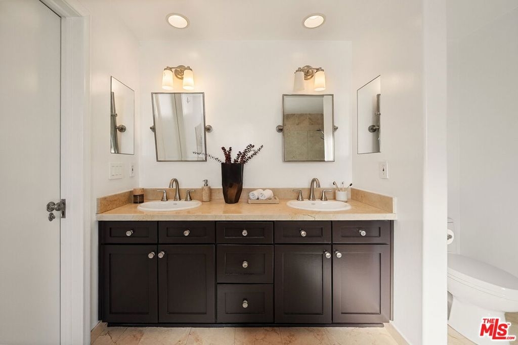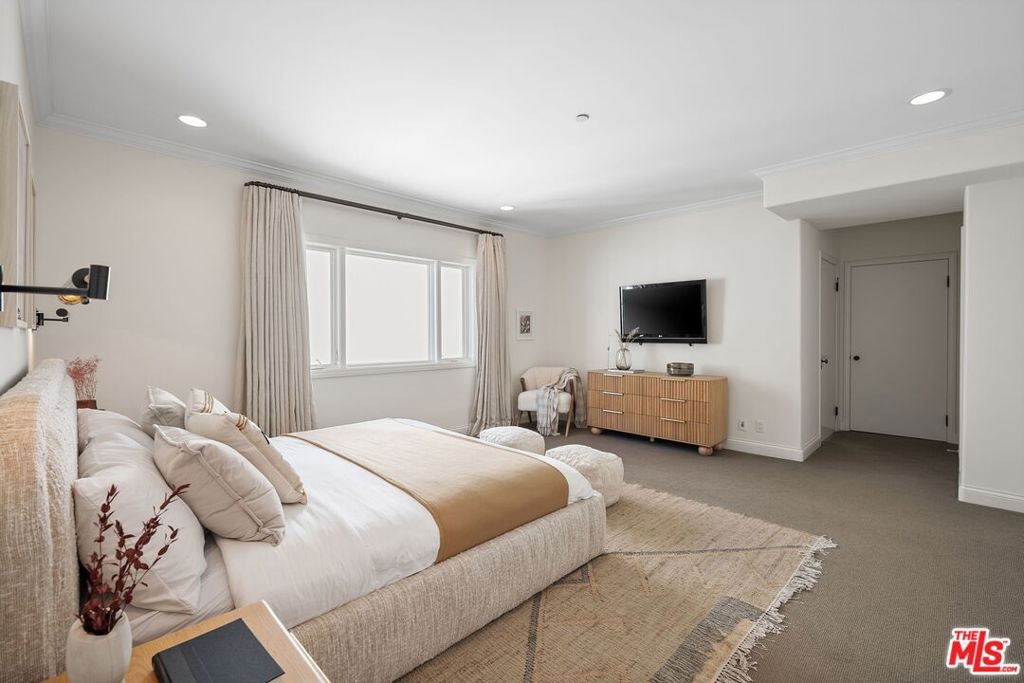 Luxurious, light, bright and spacious 3BR/2.5BA in the heart of Brentwood, just blocks from San Vicente and the Farmer's Market! Front facing with balcony, this designer DONE condominium feels like a single level home from the moment you enter. Large open living and dining room concept with recessed lighting, crown moldings, custom shelving and natural hardwood floors. Chef's kitchen with steel appliances connect to the family room with bar top and multiple eating areas. 3 bedrooms including the most divine and large primary suite with connecting spa like bathroom featuring a sunken tub, giant shower and double vanity sinks with granite countertops. Central Air/Heat and Laundry inside the unit. Controlled entry with security camera and intercom. In the gated garage, your two parking spots come with your own Tesla charging station. With only 8 units in the building makes this quiet and private retreat a wonderful place to call Home. An A+ gem and location in Brentwood. Must see!