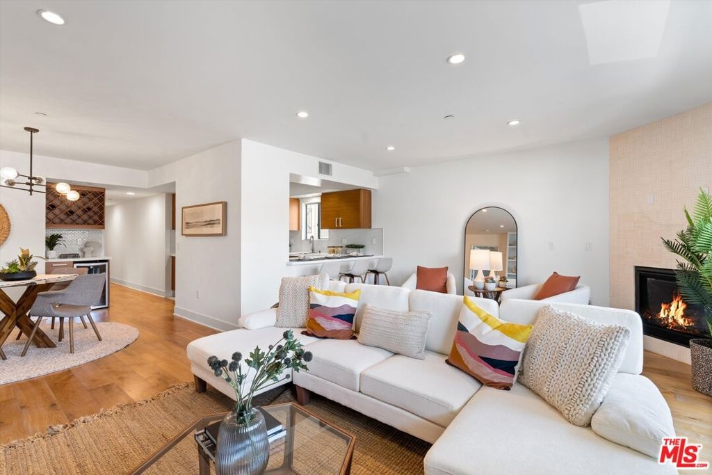 Newer construction contemporary, light & bright single-level condo in coveted Brentwood location. Enter to wide plank oak wood flooring and continue to great room featuring open kitchen, dining area, and spacious private balcony. The gourmet kitchen features white quartz countertops, custom cabinetry, stainless-steel appliances, and breakfast bar. Enjoy a separate wine fridge in living area with additional built-ins. Freshly painted with new, designer light fixtures in dining area and all bedrooms. The primary suite includes balcony access, walk-in closet, dual vanity and separate tub & shower. Two additional bedrooms and bathrooms located on the opposite side of the home. Laundry in-unit and two parking spaces in gated garage. Located in a 9-unit building with gym, rooftop sun deck, and guest parking. Enjoy the Brentwood lifestyle with numerous upscale and casual dining restaurants, shops, fitness studios, markets, and the beach in close proximity.