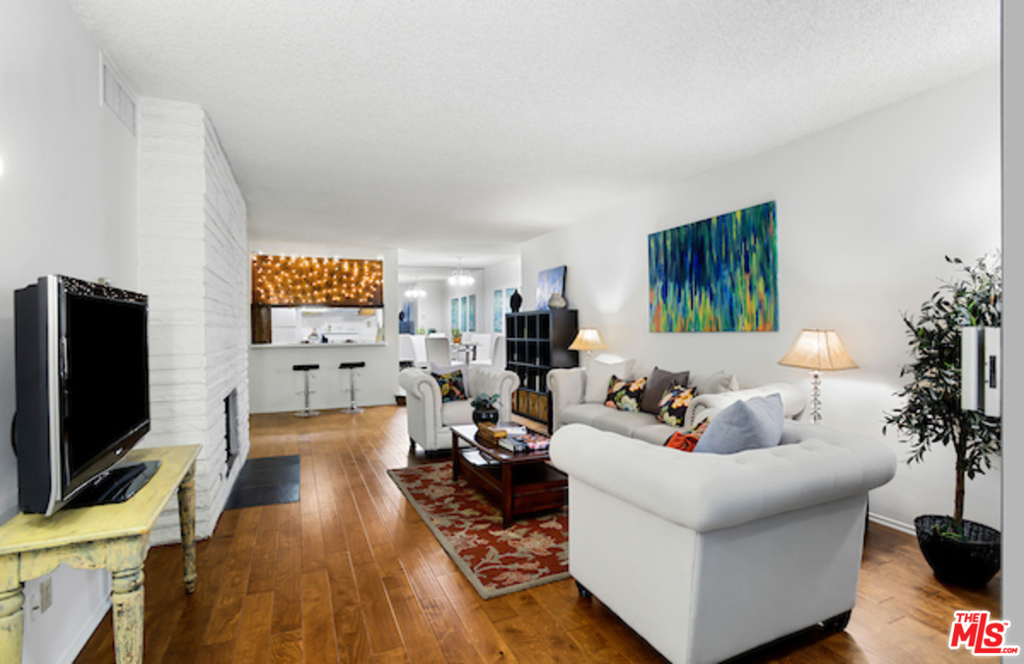 Fabulous Large One Bedroom w/ approx. 962 sqft. Very quiet and private 2nd floor unit overlooking lots of trees and greenery. Beautifully laid out distressed wood floors on a spacious and flexible floor plan. Living room with brick fireplace and wet-bar .Large private balcony, Step up formal dining area and kitchen w/ lots of cupboard space and breakfast bar. Central AC and lots of closets and storage space. Generous size bedroom with sitting area. Bathroom with separate tub and shower. One car security parking with storage. Homeowners dues include water and EQ insurance. Amenities include a pool and rooftop sundeck. The Los Leones De Brentwood Condominiums is a 19 unit complex and close proximity to Brentwood trendy shops, restaurants and famous Farmers Market.