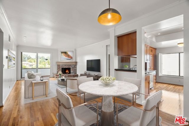 Wonderful Penthouse! Top-floor, single-level, corner unit! This beautiful 2-bedroom, 2-bath, condo is filled with natural light and lovely vistas with balcony access from nearly all rooms! Hardwood floors and central AC. Living room with fireplace looks out over treetops towards the hills! Cook's kitchen with stainless steel appliances including a gas range, well-designed cabinetry and pantry space. Generous dining area. Nice layout with bedrooms on opposite sides of the unit- each with balcony access. Primary suite enjoys views to the Getty, walk-in closet and large bath with double sinks, spa tub and separate shower. Controlled access building with assigned parking and plenty of guest spots, storage area, new elevator, and rooftop sundeck. Fantastic Brentwood location, just around the corner from tons of dining and shopping! Ready to move right in!
