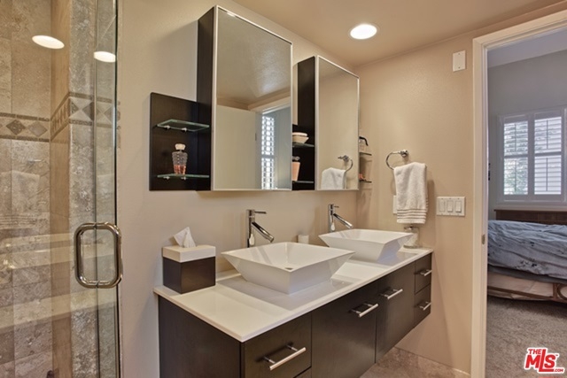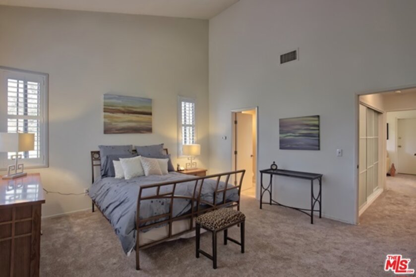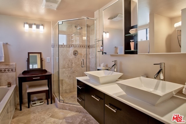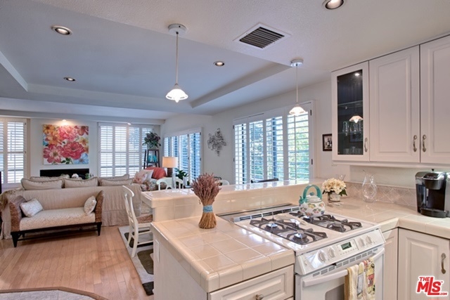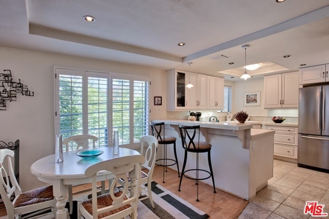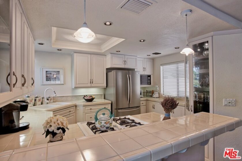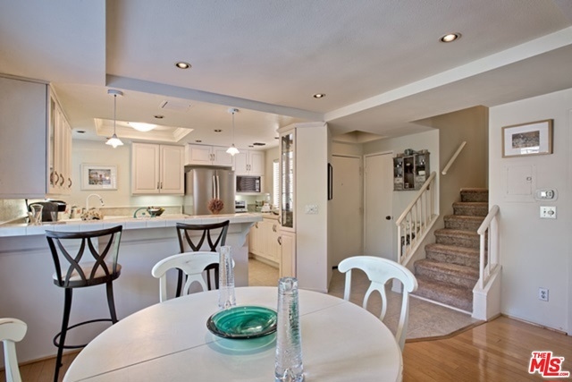 Elegant Tri-Level Penthouse Townhouse in Brentwood. Extremely quiet rear unit w/ only 1 common wall w/ approx 1780 sqft. Large and sunny private patio w/ and expansive and exclusive private sundeck.Lots of greenery views that backs up to single family homes. Hardwood floors, plantation shutters, recessed lights, open tiled kitchen w/ lots of cupboard space and breakfast bar, central heat and a/c, inside side by side laundry, Large master suite w/ vaulted ceilings a sitting area and fireplace, en-suite 2nd bedroom w/ separate exit, bathrooms w/ travertine tiles, large bonus room on upper 3rd level, side be side security parking w/ guest spots, amenities include a pool, spa , rec room and storage room. Located in Brentwood's top rated Kenter Canyon Charter School. And only a few steps to Brentwood finest shops , restaurants and markets. HOA dues include Earthquake insurance.