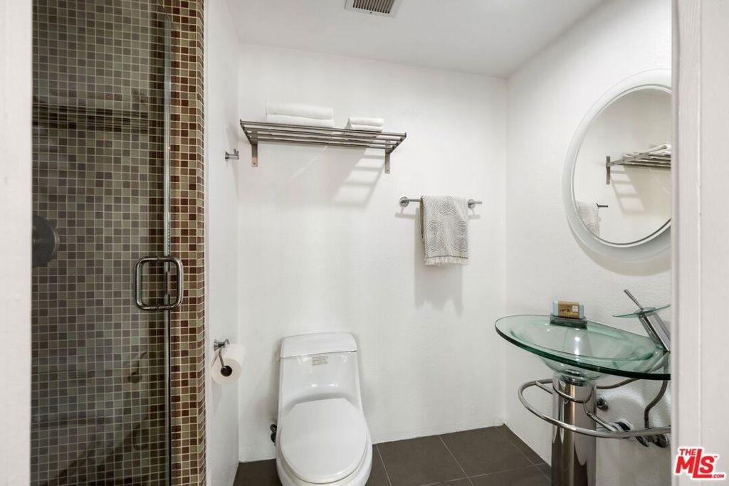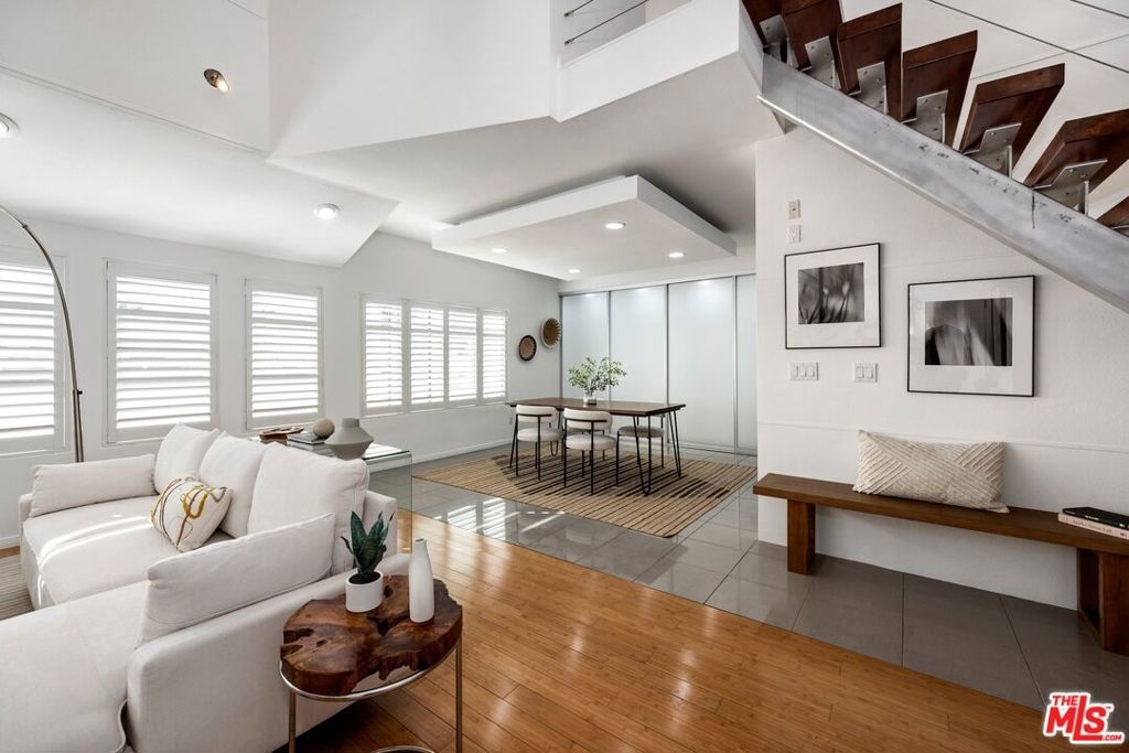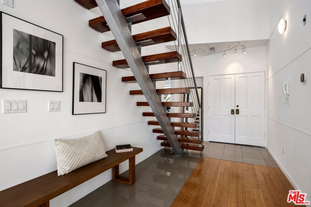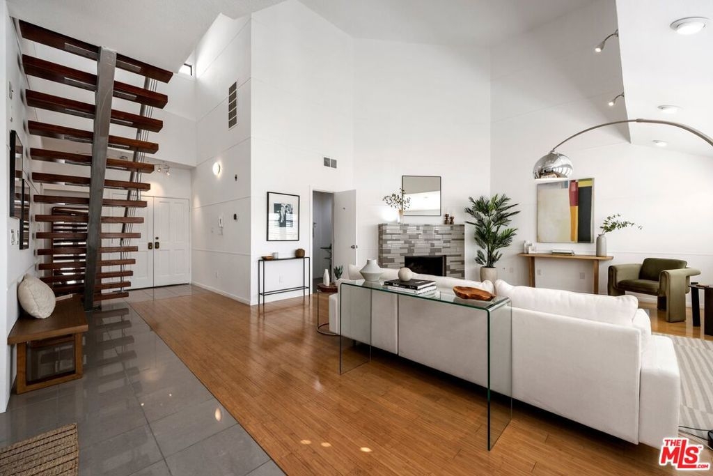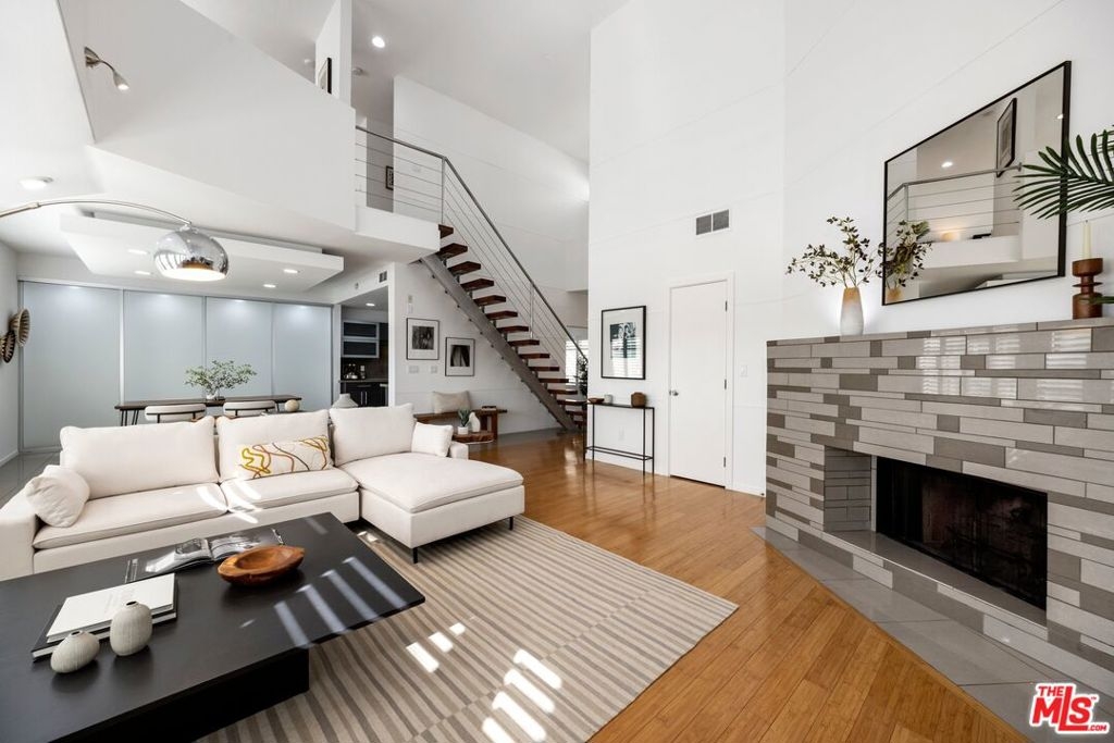 Discover this stylish and spacious condo with one bedroom and two bathrooms in the heart of Brentwood. This unit, located on the top floor, has a spacious open concept living area which invites you to entertain with ease. Windows cover the entire west-facing wall in the living area and the bedroom which brings in plenty of natural light into this home. The light is amplified with the17 foot high ceilings. The bedroom is upstairs with an en-suite bathroom for privacy and comfort. The downstairs living area includes a living room, dining room, kitchen and an additional bathroom which includes a shower. Bamboo and tile on the floors gives this unit a modern and fresh look. This unit's central air and heat will allow you and your guests to be comfortable every day of the year. Additional highlights include an in-unit stacked laundry, tank less water heater, 2-car tandem parking in a gated community garage, guests parking is available and a storage locker. Don't miss this rare opportunity to own a gem of a home in an unbeatable location. Live in Brentwood and enjoy top-tier and diverse dining, weekly Brentwood Farmers Market, state-of-the-art fitness and wellness studios. For outdoor enthusiasts, nearby hiking trails in the Santa Monica Mountains offer breathtaking views and a perfect escape into nature. Fireplace is decorative.
