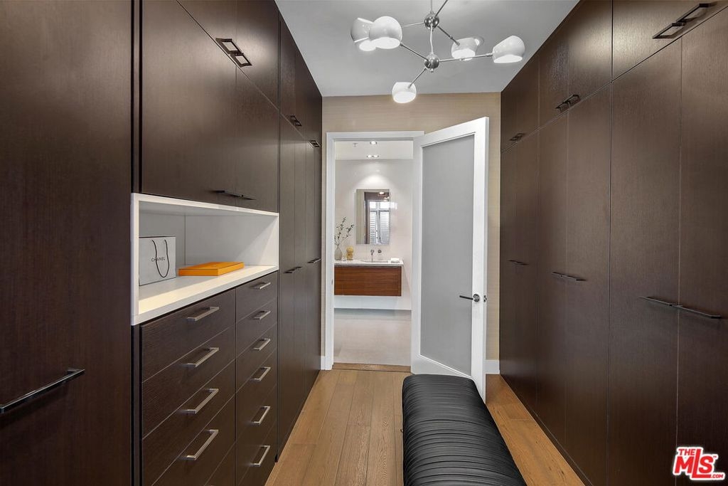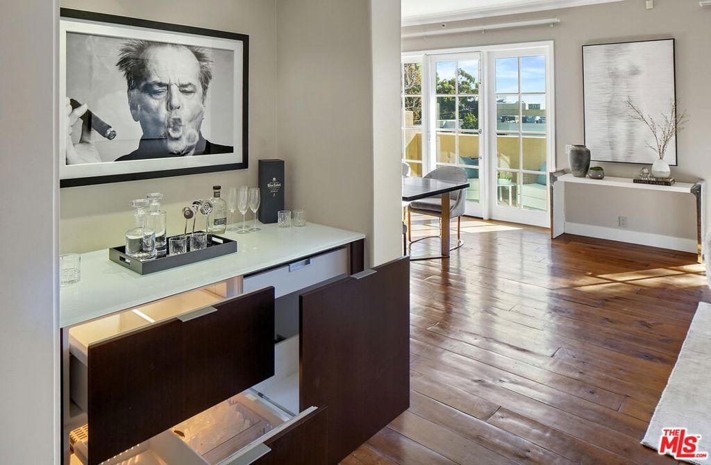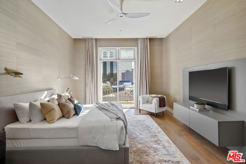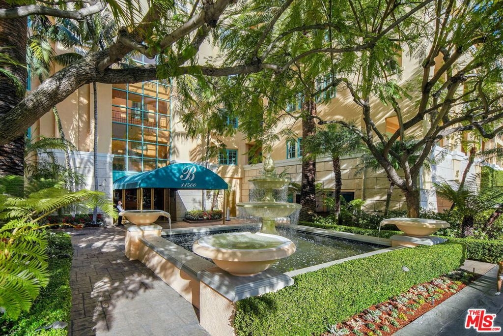 One of a kind front facing 2 bedroom and 2.5 bathroom top-floor townhouse ideally located in the neighborhood's only full-service building, "The Brentwood". This rare two-story townhome with handmade oak hardwood floors boasts an open floorplan with plenty of natural light. State-of-the-art European kitchen features Miele appliances and custom cabinetry with center island/counter. Spacious living and dining room areas with French doors that open to private balcony. Perfect area for entertaining with wet bar and custom built-ins with refrigerator and freezer drawers. Upstairs, the master bedroom suite has hardwood floors, soaring high ceilings, and French doors that open to a private balcony with city views. Generously sized custom-built walk-in closet and a spa-like bathroom with heated floors, marble counters, double vanity, an oversized shower and soaking tub. The second bedroom with custom built ins completes the floor plan and could be used as bedroom, office, or both. There is plenty of closet space throughout, ample storage, in unit washer and dryer and 3 side-by-side valet or self-parking spaces along with available guest parking. Building amenities include: 24-hour security, front desk concierge, on-site management, fitness center, rooftop pool/hot tub, banquet room, valet parking and EV charging station. Centrally located and within walking distance to Brentwood's finest shops and restaurants. HOA Fees include: Basic cable, internet, water, trash, and E/Q insurance.