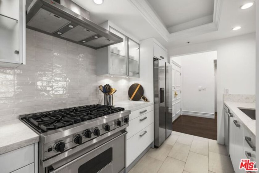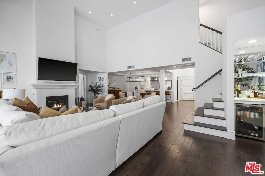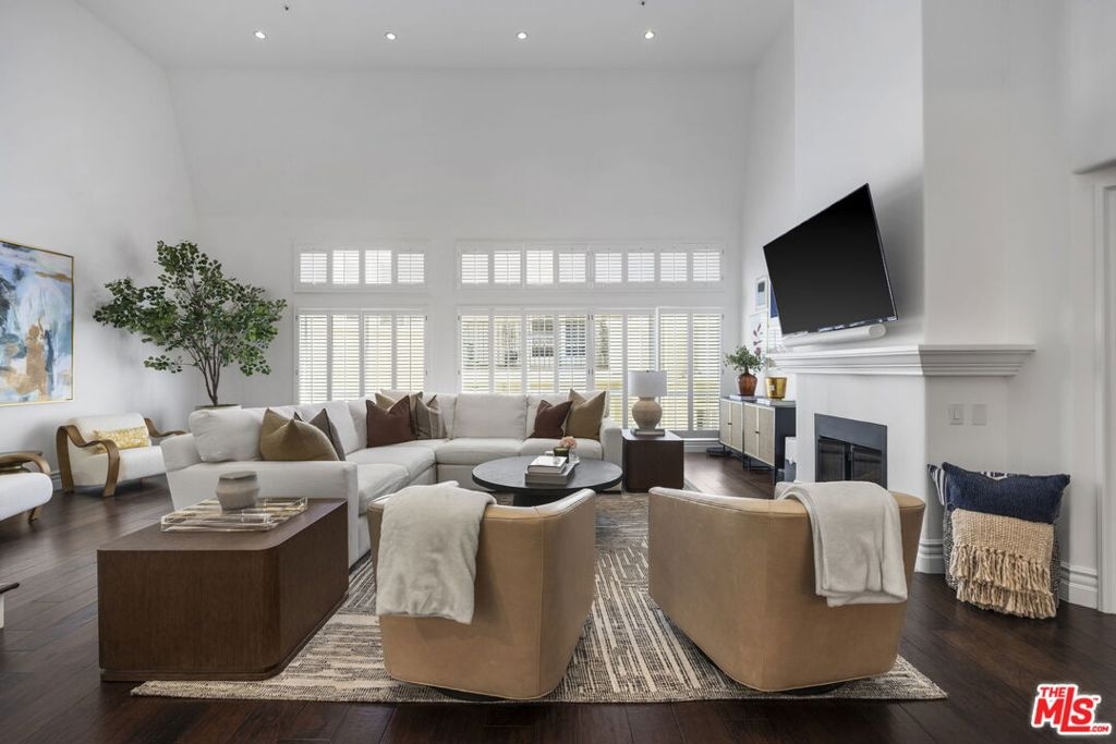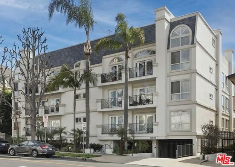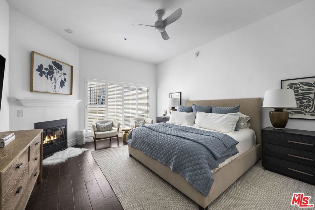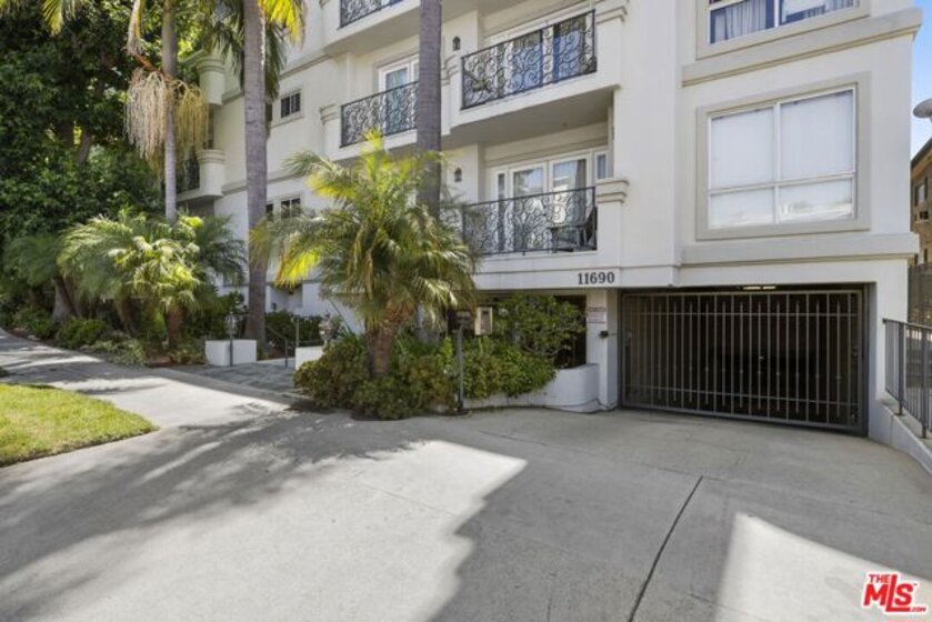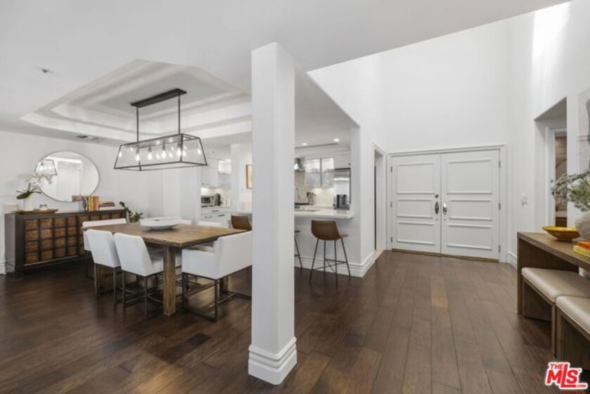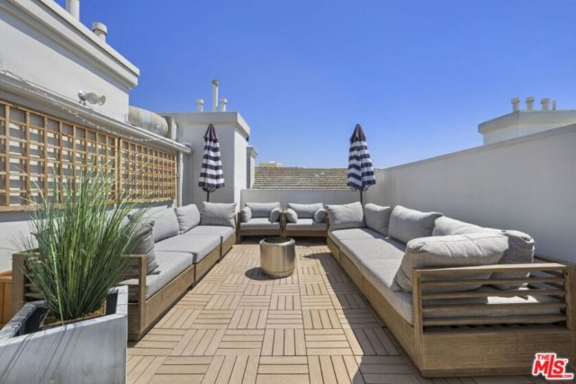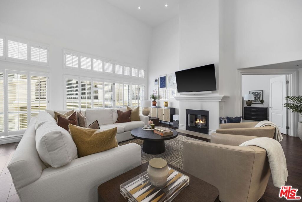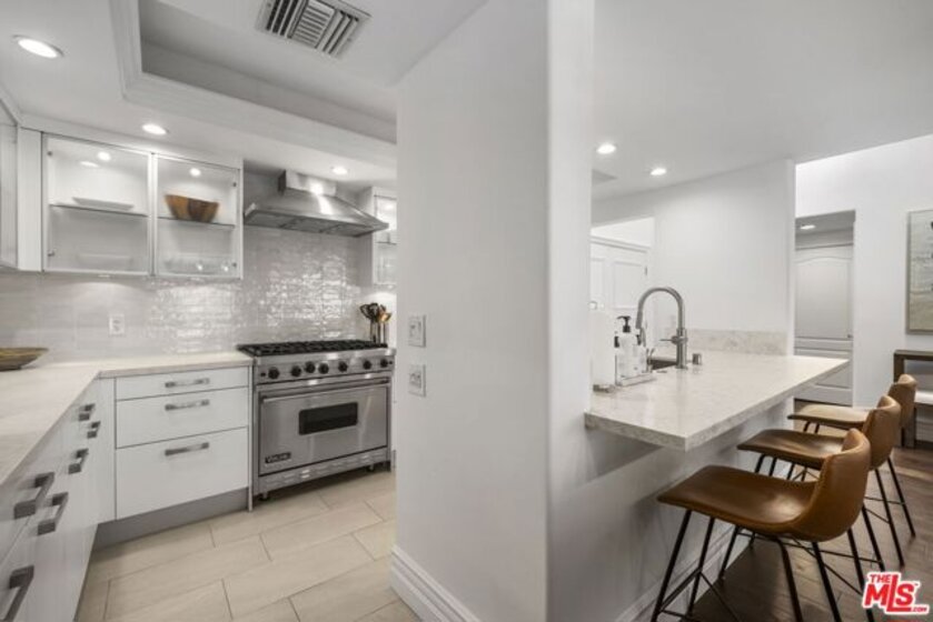 Completely remodeled penthouse in "Villa Monet". Prime Brentwood location close to coffee bars, restaurants & retail on trendy San Vicente Blvd. Elegant double door entry with 18' ceilings & skylight. Spacious living room, also with 18' high ceilings, fireplace & large windows with plantation shutters, allowing in tons of natural light. Exquisite open kitchen with quartz counters, custom cabinets & stainless steel appliances including Viking range/oven. Super hip bar/sitting area finished with quartz counter & wine cooler. Primary bedroom with huge windows, also with plantation shutters, fireplace, and large walk-in closet. Beautifully remodeled primary bathroom with dual sinks, large walk in shower and free standing tub. Second bedroom/loft with en-suite bathroom & access to huge outdoor patio area with separate sitting and dining areas. Gorgeous wood floors. Full laundry room. Additional storage inside the unit and in the garage. Villa Monet has an indoor swimming pool, fitness center and secure guest parking.