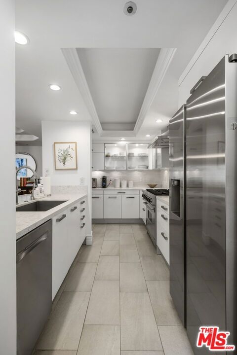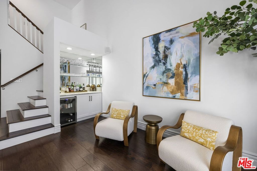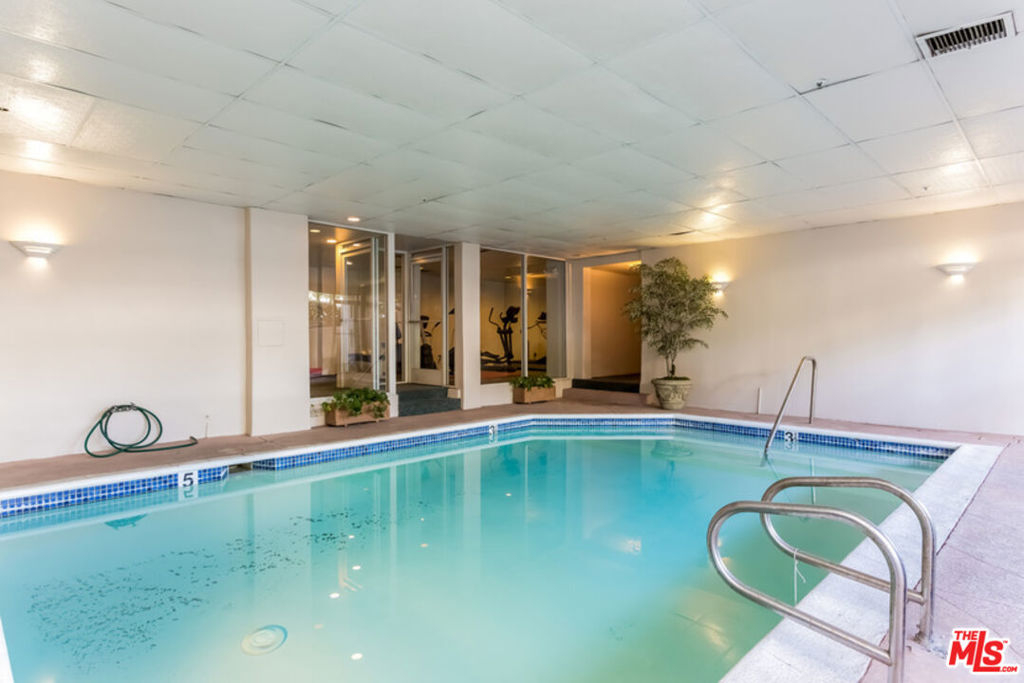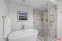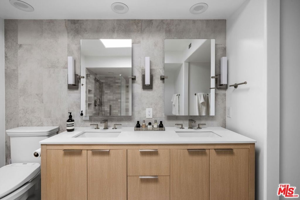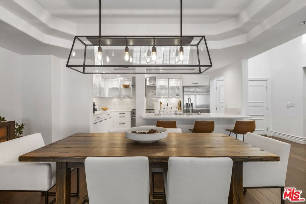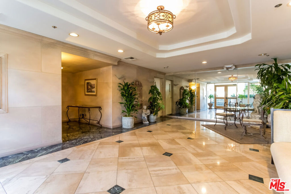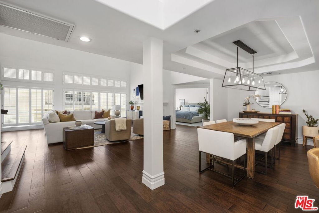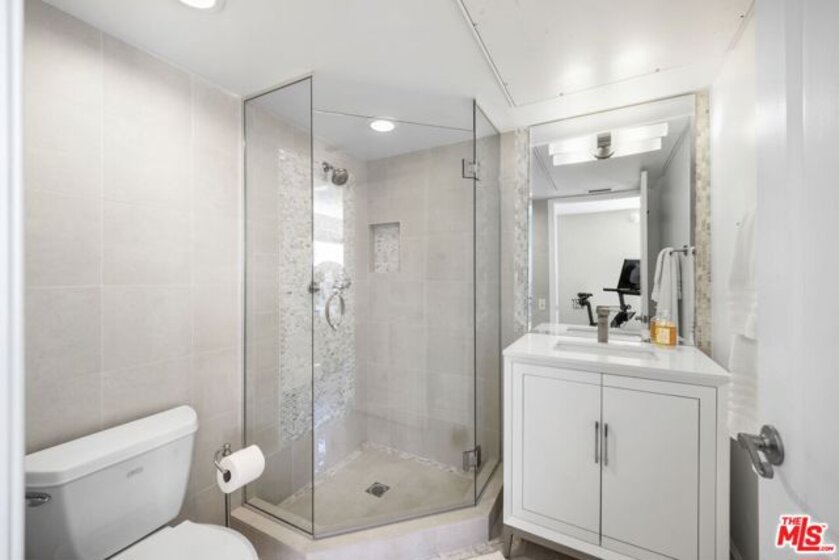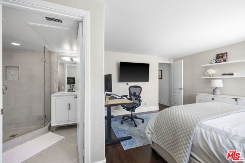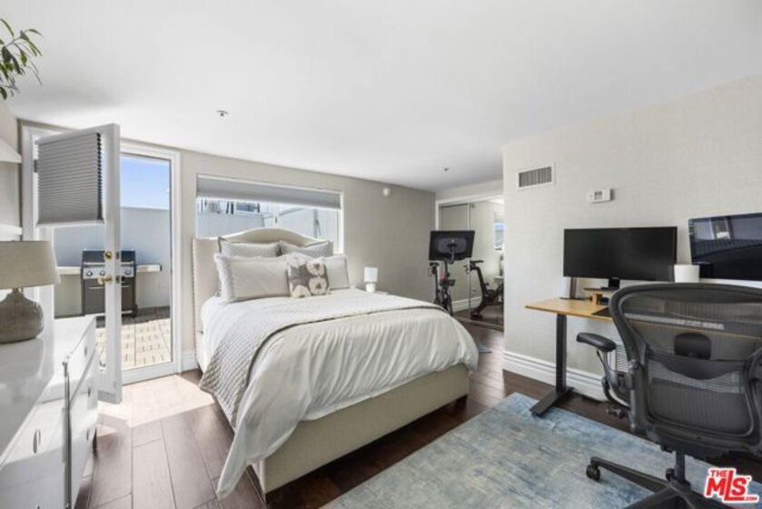 Completely remodeled penthouse in "Villa Monet". Prime Brentwood location close to coffee bars, restaurants & retail on trendy San Vicente Blvd. Elegant double door entry with 18' ceilings & skylight. Spacious living room, also with 18' high ceilings, fireplace & large windows with plantation shutters, allowing in tons of natural light. Exquisite open kitchen with quartz counters, custom cabinets & stainless steel appliances including Viking range/oven. Super hip bar/sitting area finished with quartz counter & wine cooler. Primary bedroom with huge windows, also with plantation shutters, fireplace, and large walk-in closet. Beautifully remodeled primary bathroom with dual sinks, large walk in shower and free standing tub. Second bedroom/loft with en-suite bathroom & access to huge outdoor patio area with separate sitting and dining areas. Gorgeous wood floors. Full laundry room. Additional storage inside the unit and in the garage. Villa Monet has an indoor swimming pool, fitness center and secure guest parking.