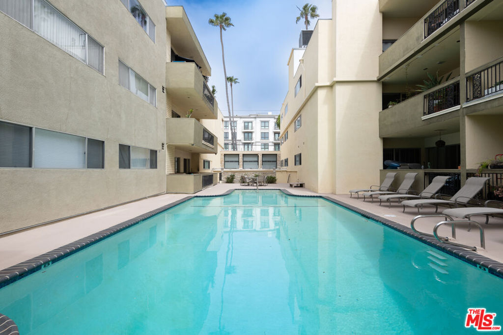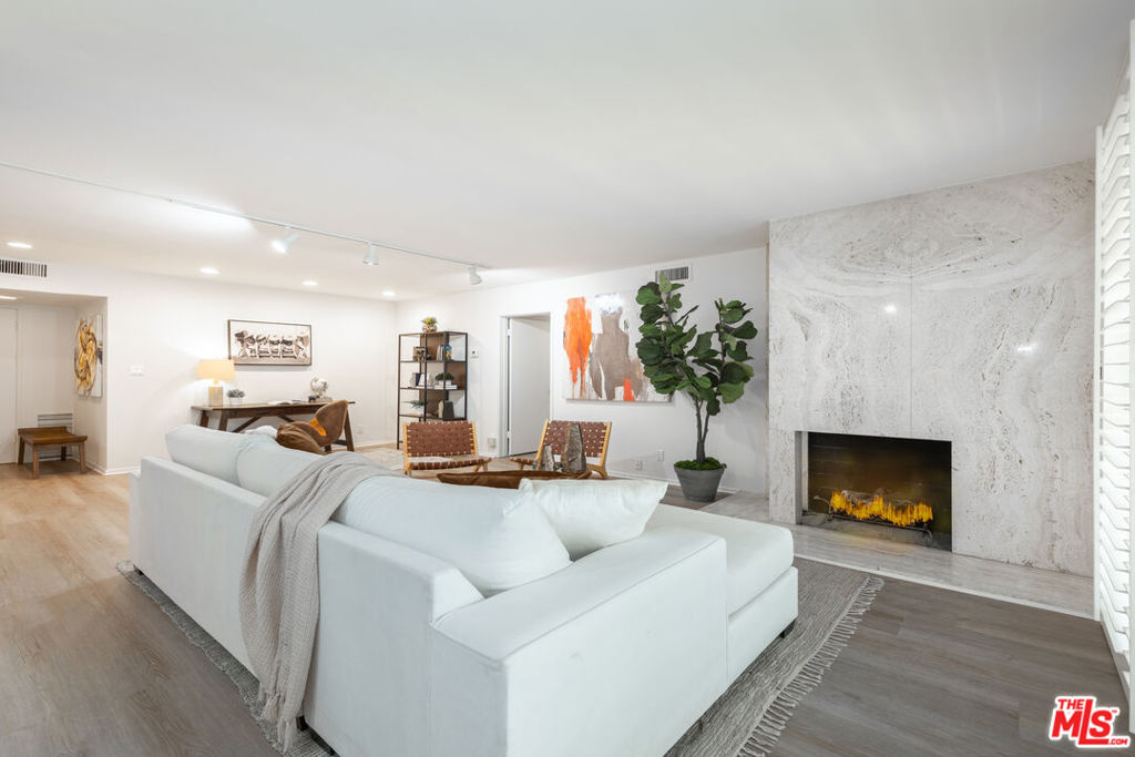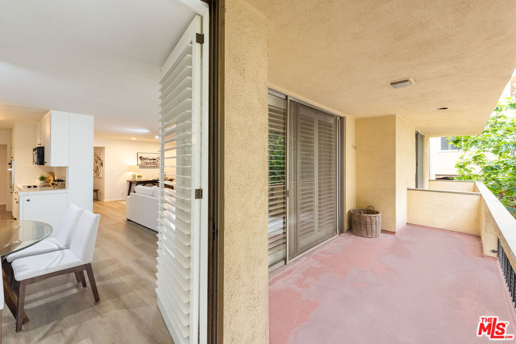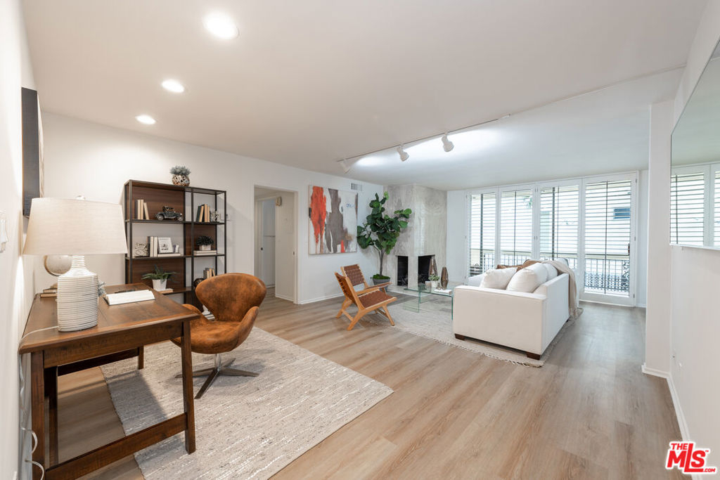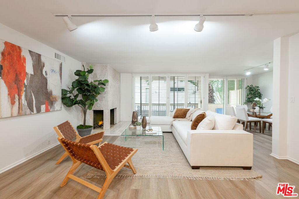 Welcome to Villa Montana-a coveted Mid-Century updated building steps from the finest shops and restaurants on San Vicente and truly the ideal location. This recently upgraded spacious 1 br is a quiet rear corner unit in this coveted courtyard building with pool, gym and sauna. The ideal floor plan offers a gracious entry, recently installed engineered light Oak floors, plantation shutters & a split living/office area anchored by a wood burning gas fireplace with travertine mantel wall. A galley kitchen features a new dishwasher, Viking oven & abundant storage. Dual sink bath en-suite bath with tub/shower combo. A 35-ft long covered balcony is accessed through walls of glass from the bedroom & living/dining areas offering the ideal alfresco retreat for morning coffee or evening cocktails. The gated parking garage space is directly adjacent to the door accessing the elevator lobby. An additional secured storage area in the garage is included. This unit is ready to move in and enjoy all that the Brentwood lifestyle has to offer.