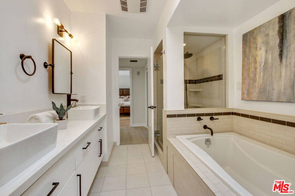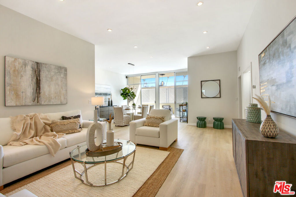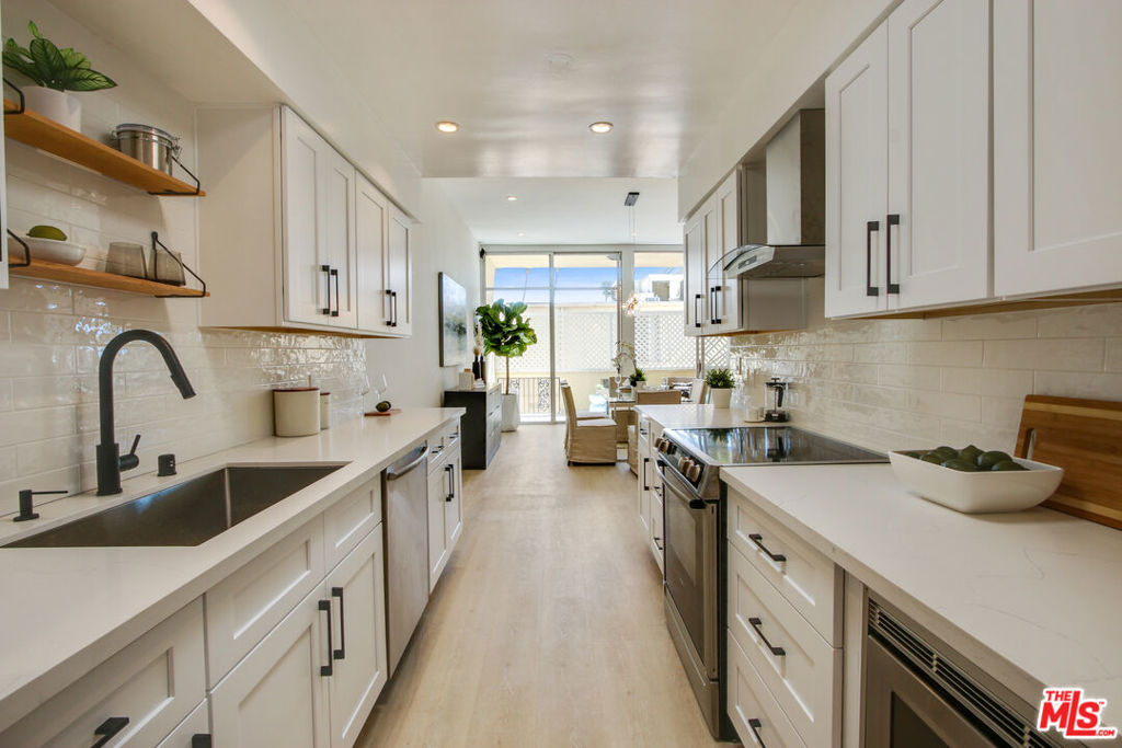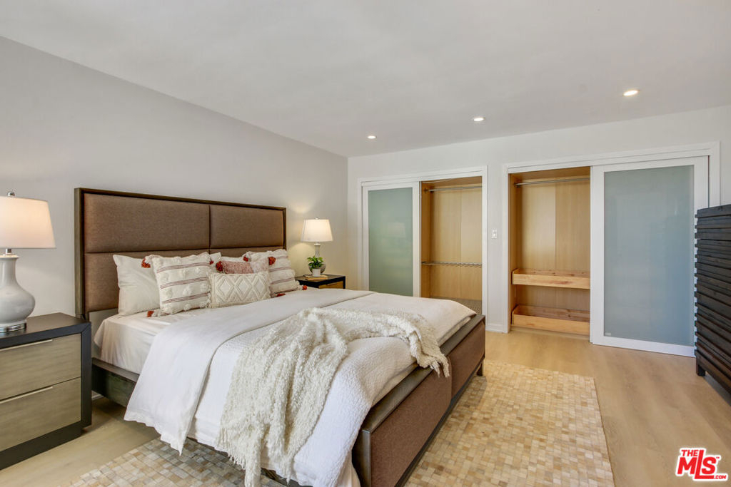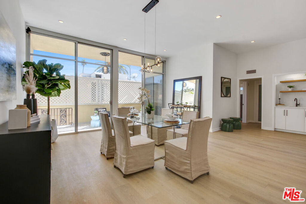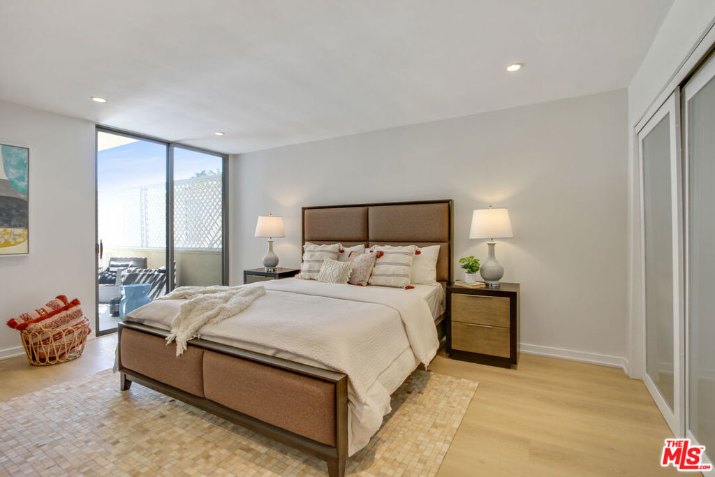 Sophisticated penthouse-like living in the heart of Brentwood! This beautifully remodeled condo is one of the largest one bedrooms in all of Brentwood at over 1,100 SF with soaring 10 foot ceilings. Large, floor-to-ceiling patio doors and skylights flood this unit with tons of natural light. The kitchen has been newly remodeled with all new cabinets and quartz countertops. High-end finishes include all stainless steel Bosch appliances, all new flooring, Nest thermostat and built-in wet bar. The full bathroom features new quartz countertops with a large double sink vanity and separate water closet and sink, which can be closed off for guest use. The extremely spacious bedroom easily fits a king bed and features an entire wall of closets with professional built-in organizers. The updated, secured building features a pool, gym, sauna, gated covered parking and is around the corner from the Brentwood farmer's market, Whole Foods, and all the lovely dining and shopping on San Vicente.