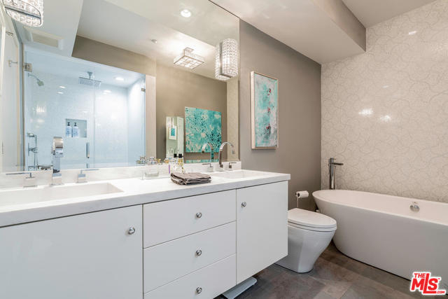 Come marvel at this spacious, beautifully remodeled 2 bedroom, 3 bathroom condo located in the heart of Brentwood. Highlights include top of the line designer finishes throughout, hardwood flooring, vaulted ceilings, expansive living room w/ balcony and impressive master suite. On the first floor you will find a true chef's kitchen showcasing modern Viking kitchen appliances, custom designed cabinetry and breakfast bar surrounded by Caesarstone kitchen countertops. An open living room creates the perfect space for entertaining with an impressive powder room for guests close by. On the second level, you will find a stunning master suite featuring a spa-like bathroom: marble vanity, Porcelanosa tile, Italian fixtures, custom floors, soaking tub, along with second en-suite bedroom and custom built laundry room. The building is secured and private located on a quiet tree-lined street, with low HOA's and 2 car parking in the garage.