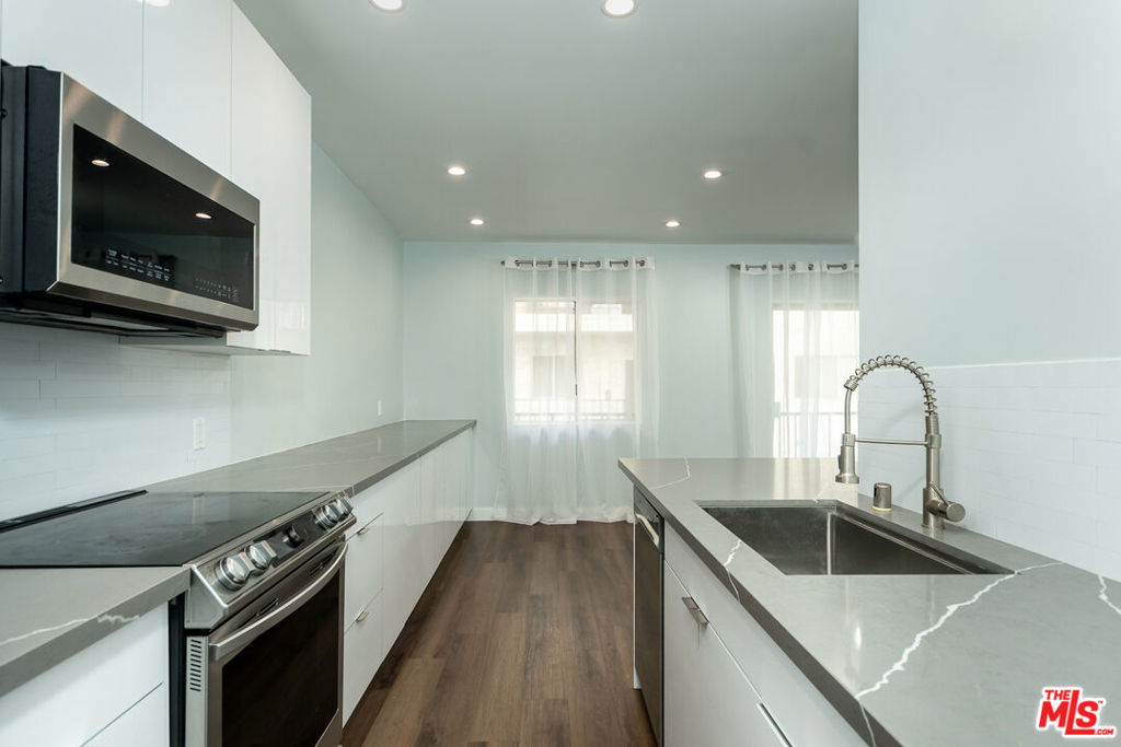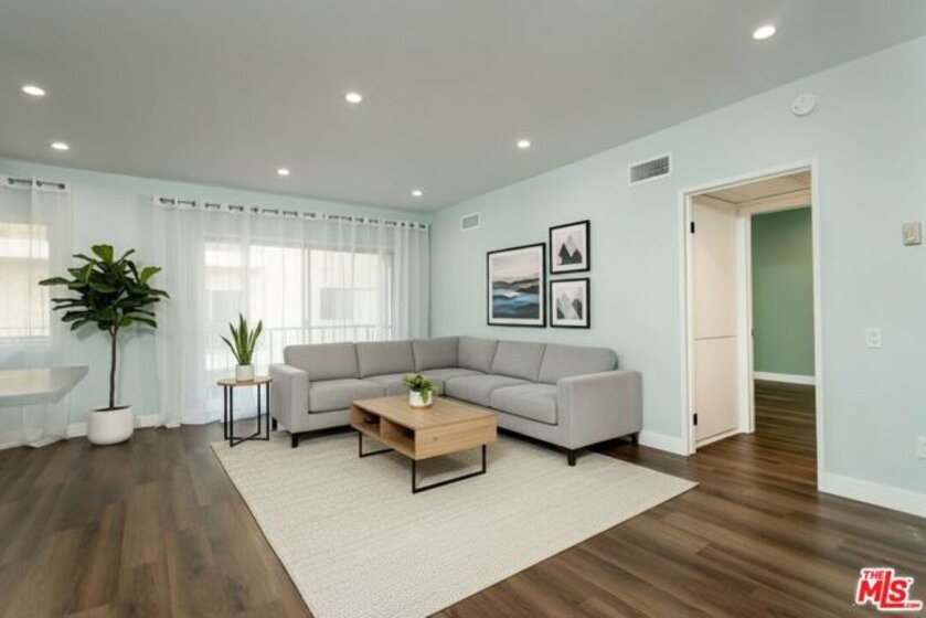 Prime Beverly Hills adjacent location in the desirable Beverly Towers. Wait until you see this beautifully reimagined modern one bedroom and one and three quarter baths unit completed in 2022. This corner unit (only shares 1 wall) has a flowing open floor plan with great natural light. The newly remodeled kitchen features abundant storage, new cabinets, quartz counters, smart stainless steel appliances and bar for seating. Separate dining area that opens to the spacious living room with a dry bar and wine fridge. Large bedroom with excellent closet space. Spacious balcony. Oversized windows and sliders. Double drywalled for additional sound proofing, Hardwood style floors (waterproof vinyl), recessed lighting, newer paint. Unit looks out over the spacious courtyard. 2 car parking, central heat and a/c. Solid HOA with monthly dues of only $480 which include water, earthquake insurance and great amenities including pool, spa, fitness suite, rec room, and bike storage room and additional storage. Walk to Houses of Worship, great shopping, dining, and other well known destination points. Priced aggressively!
