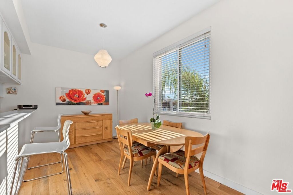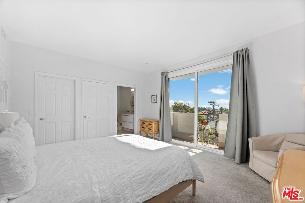 Bright south-facing top-floor corner unit in an intimate 24-residence community, ideally located just moments from Brentwood. This elegant 2-bedroom, 2.5-bath home has been thoughtfully remodeled and is truly move-in ready. Expansive windows and multiple balconies fill the space with natural light and showcase sweeping ocean, city, and sunset views. The living room features warm wood floors and a stylish fireplace, creating a refined yet inviting atmosphere. The well-appointed kitchen features generous countertops, ample cabinetry, and a breakfast bar that flows seamlessly into a dedicated dining area large enough for a full-size tableperfect for entertaining. A full-size laundry room with exceptional storage adds everyday convenience. The spacious primary suite includes a walk-in closet, a sitting area, and a private balcony, while the guest bedroom enjoys its own full bath and ample storage. A separate powder room adds flexibility for guests. Additional highlights include secure entry, a rooftop deck, recently replaced central HVAC, two secure covered parking spaces, and plentiful guest parking. HOA dues include earthquake insurance. Just one block from Brentwood Village's popular restaurants and coffee shops, with easy access to Sawtelle, UCLA, Santa Monica, Century City, and the 405 and 10 freeways.