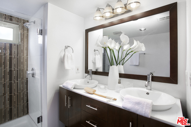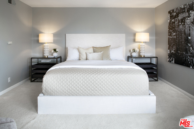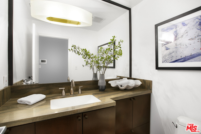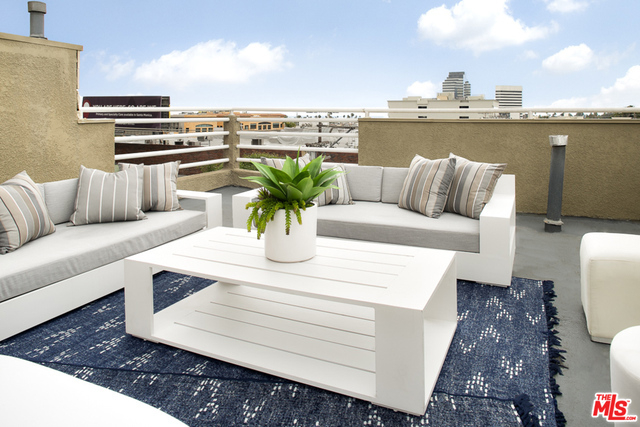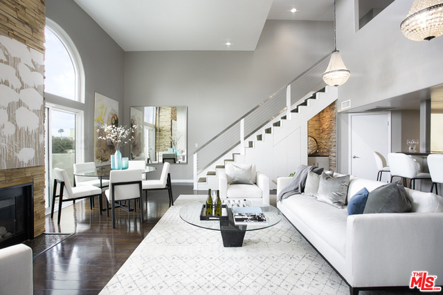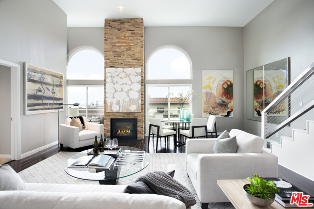 Rare penthouse in prime Brentwood location between Wilshire and San Vicente Boulevards. Upon entering the home, you'll be immediately struck by the double height living room that's flooded with natural light and warmed by an imposing stone fireplace. The large space accommodates both living and dining areas as well as a breakfast bar that faces into the open kitchen. Off the hall, you'll find a powder room as well as in-unit laundry. A spacious master bedroom with fireplace and a second bedroom--both with ensuite baths--complete the first floor. Upstairs you'll find a flexible loft space that leads out to an enormous private rooftop deck with peek-a-boo views of the ocean. Truly a wonderful home for entertaining.