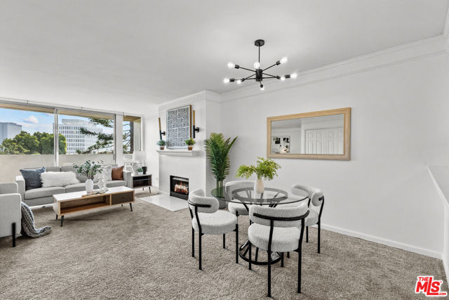 Located in one of Brentwood's premier residential pockets, this beautifully refreshed top-floor, one-bedroom home offers 852 square feet of bright, welcoming living space with treetop and city views. An open layout introduces a spacious living room with a sleek gas fireplace, crown molding, and oversized windows that fill the home with natural light. The dining area transitions into a newly updated kitchen featuring white shaker-style cabinetry, quartz-style countertops, a deep single-basin undermount sink, a new range, and a raised bar ideal for casual seating or entertaining. A private balcony extends from the main living area and provides a relaxing outdoor space framed by lush greenery with views of the Brentwood skyline. The generous bedroom offers a peaceful retreat with plush carpeting, a floor-to-ceiling window, and a large walk-in closet. The updated bathroom features a warm wood vanity, matte black fixtures, a full bath, and contemporary lighting. Community amenities include an on-site pool, a spa, outdoor lounge areas, and controlled access. The unit also offers two tandem covered parking spaces. This highly sought-after neighborhood is known for its refined lifestyle, with proximity to upscale shopping at the Brentwood Country Mart. Nearby cafes, boutiques along San Vicente, and cultural attractions such as the Getty Center further enhance the appeal. Brentwood's blend of luxury amenities, elegant surroundings, and everyday convenience continues to make it one of Los Angeles' most desirable places to call home.