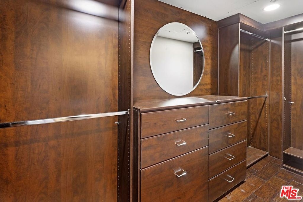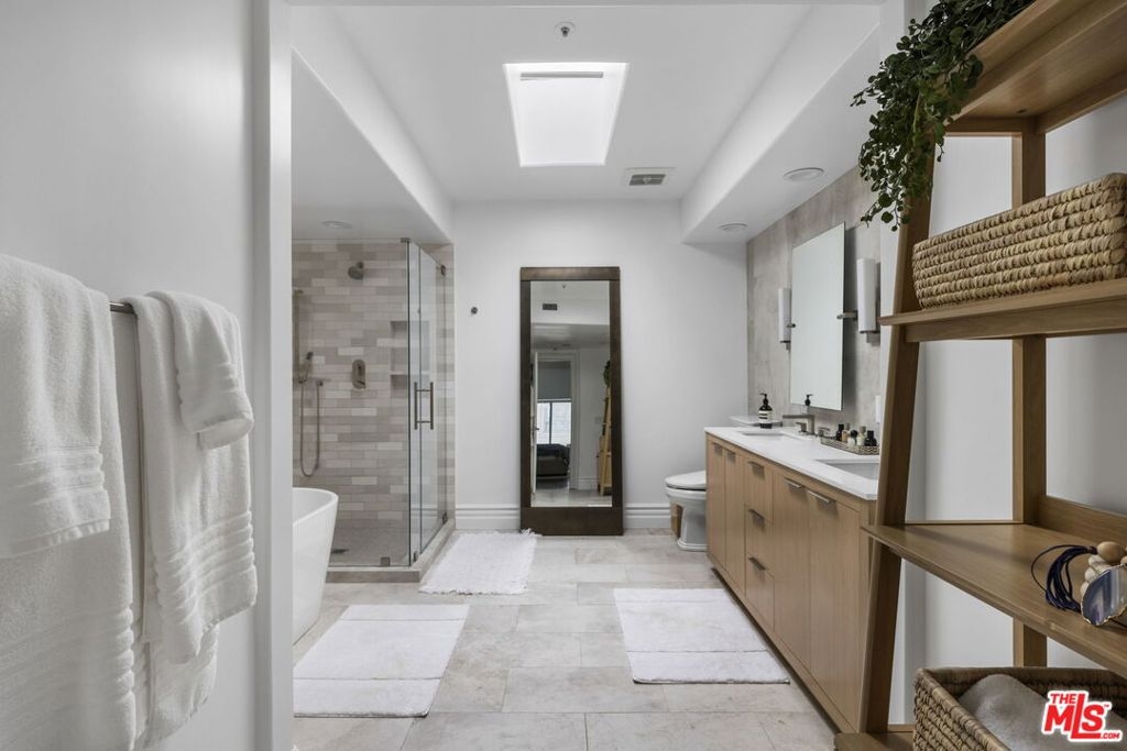 Completely remodeled penthouse in "Villa Monet". Prime Brentwood location close to coffee bars, restaurants & retail on trendy San Vicente Blvd. Elegant double door entry with 18' ceilings & skylight. Spacious living room, also with 18' high ceilings, fireplace & large windows with plantation shutters, allowing in tons of natural light. Exquisite open kitchen with quartz counters, custom cabinets & stainless steel appliances including Viking range/oven. Super hip bar/sitting area finished with quartz counter & wine cooler. Primary bedroom with huge windows, also with plantation shutters, fireplace, and large walk-in closet. Beautifully remodeled primary bathroom with dual sinks, large walk in shower and free standing tub. Second bedroom/loft with en-suite bathroom & access to huge outdoor patio area with separate sitting and dining areas. Gorgeous wood floors. Full laundry room. Additional storage inside the unit and in the garage. Villa Monet has an indoor swimming pool, fitness center and secure guest parking.