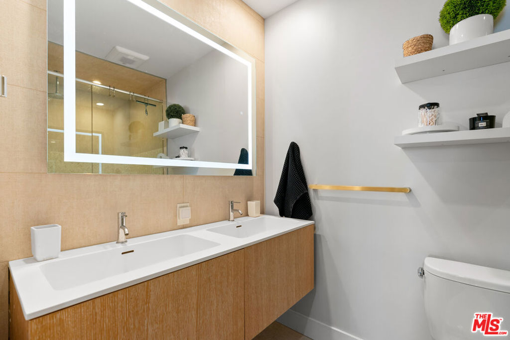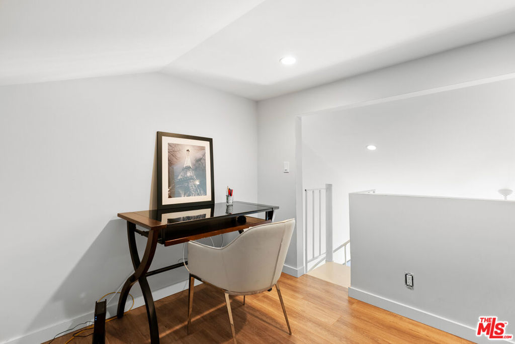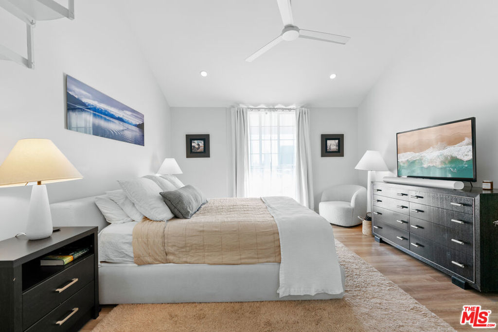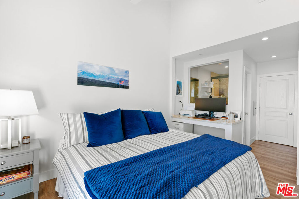 Welcome to this stunning and light-filled penthouse condo in the heart of Brentwood! Offering unparalleled privacy with no shared walls, this impeccably upgraded 2-bedroom + office, 2-bathroom home boasts 16-foot vaulted ceilings and a house-like ambiance atop the building. The expansive open floor plan features a spacious living area with a renovated gas fireplace, two private balconies, and sleek wood floors throughout. The remodeled gourmet kitchen is equipped with light wood cabinetry, granite countertops, a stainless steel Viking range, and a Thermador refrigerator, making it a chef's dream. Both bedrooms are thoughtfully designed, with the primary suite featuring a custom California Closet walk-in wardrobe, a remodeled en-suite bath with a luxurious glass walk-in shower, and an office loft. The second bedroom includes its own fully remodeled bathroom and a built-in desk, perfect for a home office setup. This south-facing unit is ideally situated for peace and quiet, offering impressive views of the Santa Monica Bay, Catalina Island and Palos Verdes, while being tucked away from the bustle of Montana and Barrington. Additional features include in-unit laundry, two large side-by-side parking spaces in a gated garage, and 200 sq. ft of in-unit storage space, plus an additional storage unit in the garage. The building itself provides an array of amenities, including a sparkling swimming pool, fitness center, gated parking, and earthquake insurance. Incredibly well located and walking distance to Brentwood's top-rated restaurants, boutique shops, Whole Foods, fitness studios, and more! This exceptional penthouse is a rare find that perfectly combines location, style, comfort, and conveniencedon't miss the opportunity to make it yours!
