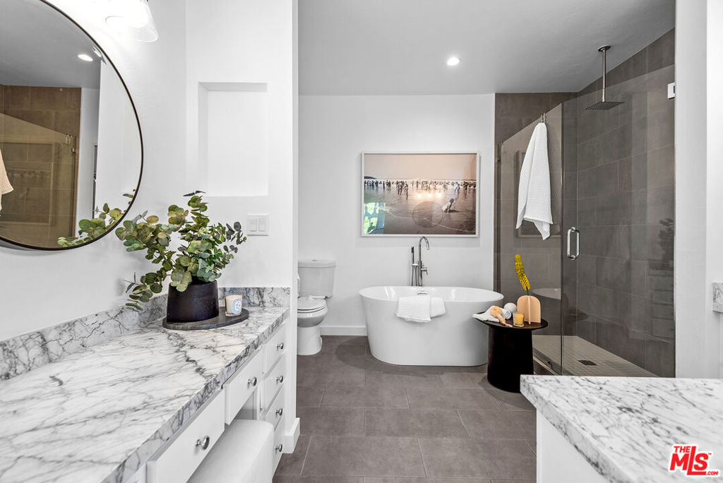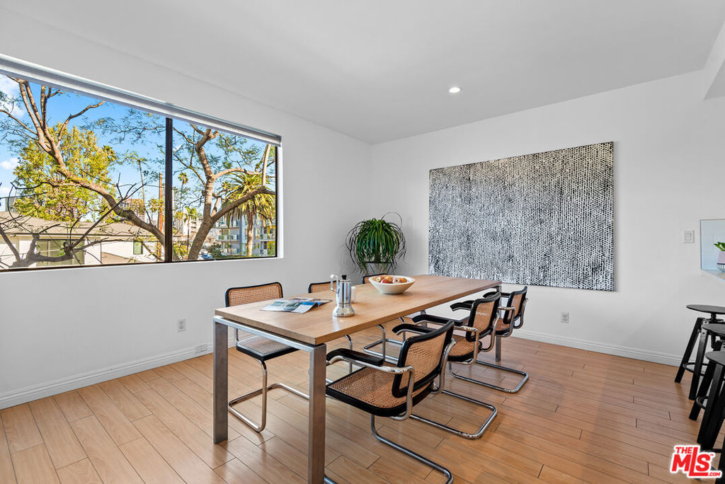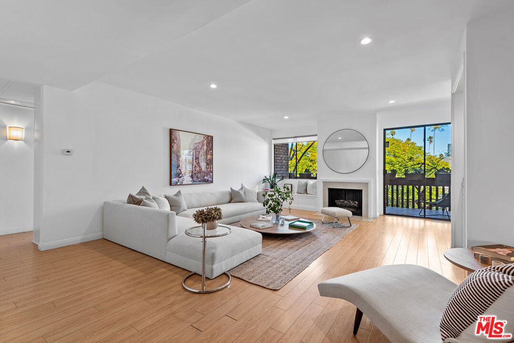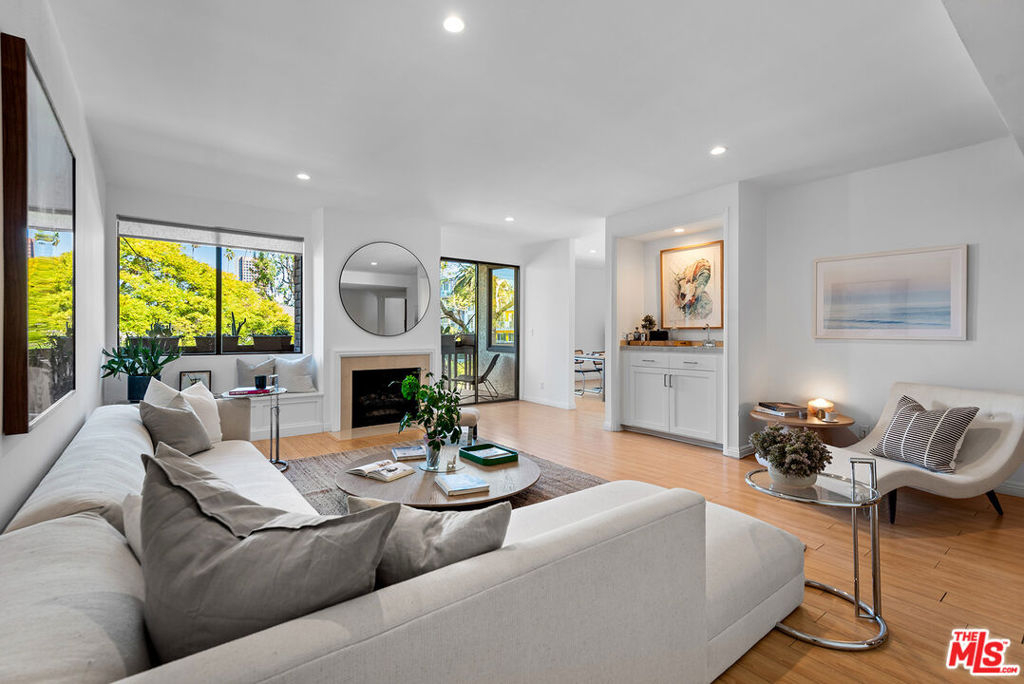Prime 2BR+2.5BA front-facing corner unit in the heart of Brentwood. Open floor plan with tree top views throughout. A large living room with fireplace and wet bar overlooks the sizable balcony. Updated open kitchen with quartz countertops, new stainless-steel appliances with Bosch dishwasher and refinished cabinets with soft closing drawers. Additional space could be a home office or possible 3rd bedroom. Spacious primary suite with ample closet space and spa like bathroom with rain shower, dual sinks and separate tub. The second bedroom has an ensuite bathroom with tub/shower combo. Side by side washer/dryer. Separate powder room. There are side by side parking spaces with a car charger. Large communal storage and additional storage above parking spots. Close to shops, restaurants and the famous Brentwood Farmers Market. Would make a wonderful place to call home.