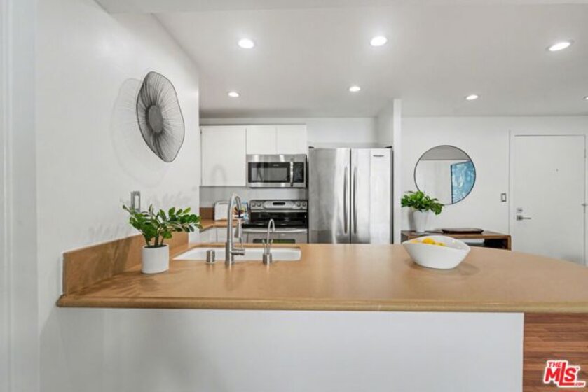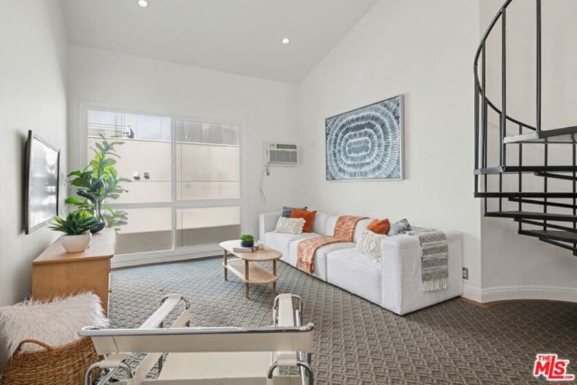 Desired Top floor 2 bed/1 bath corner-unit on quiet backside of The Colony at Westwood, with secured entry, updated pool/spa/gym/laundry, lounge and recreation room. 2 level unit with open floor plan that includes high ceilings, recessed lighting in living room, kitchen with quartz countertops, stainless steel appliance and breakfast bar. 1 bedroom on main level with 2 closets and updated full bath with floating sink and tile finishes. Spiral staircase leads to 2nd bedroom/open loft area with skylight and hardwood floors. Extra bonus space upstairs ideal for office/storage. Pets ok, secured 1 parking space in front garage, common area EV charging, common area laundry. Ideal close proximity and convenient location within a few blocks of UCLA campus and all the great retail, grocery and restaurants in Westwood Village and Westwood Blvd. including Whole Foods, Bristol Farms, Trader Joe's, 99 Ranch Market, Sprouts, and many coffee shops and restaurants. Also, close to Westwood Recreation Center, Tennis and Park, Westfield Century City and Beverly Hills. Move-in ready!