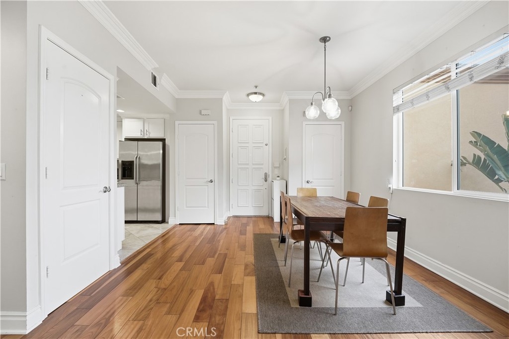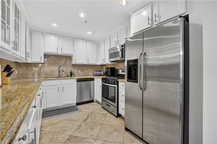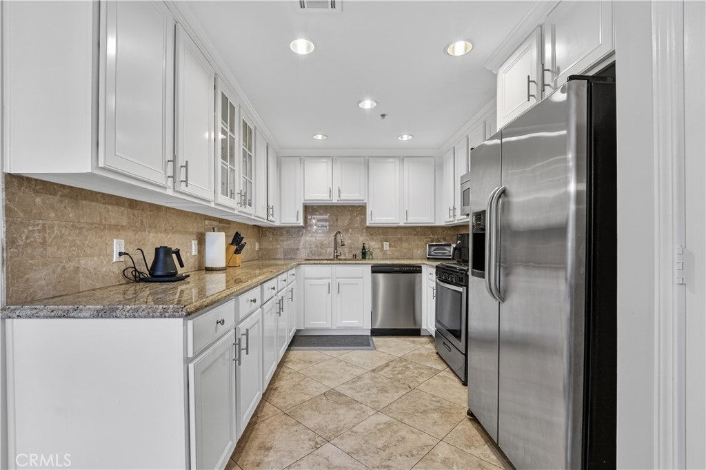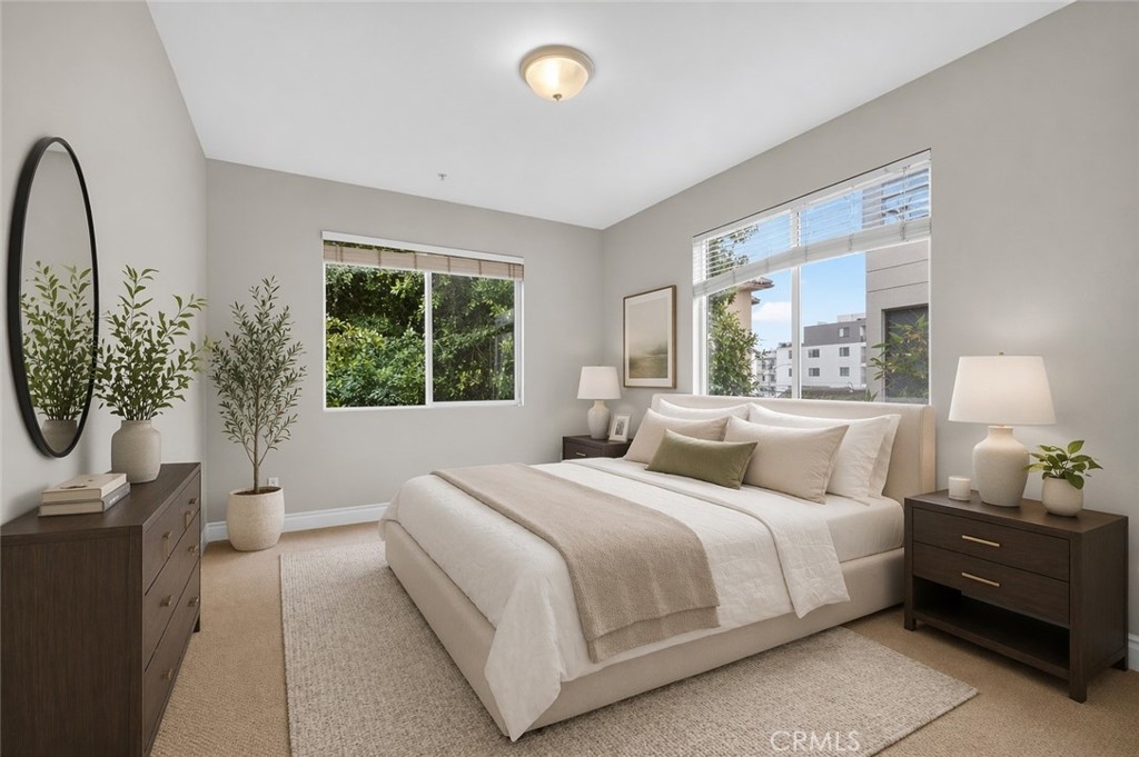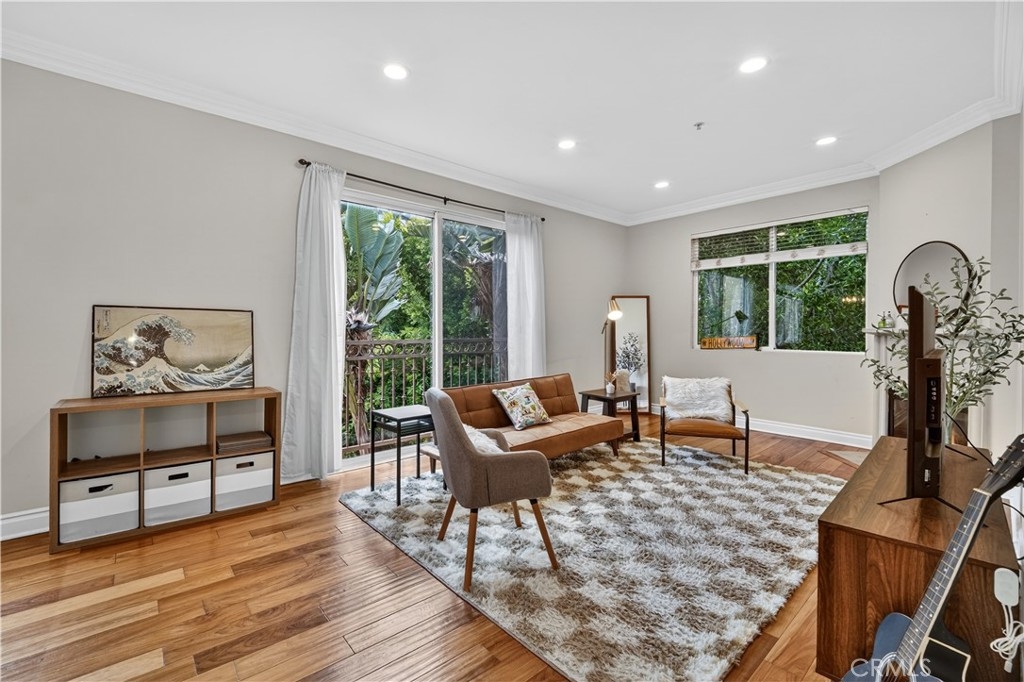 Exceptional top floor penthouse residence filled with charm, surrounded by lush greenery, and offering privacy at its finest. Tucked away as a corner unit at the rear of the building, this home feels distinctly separate and elevated. Upon entry, you’re greeted by abundant eastern sunlight streaming through oversized windows and sliding doors, illuminating the formal living and dining areas. Soaring ceilings and rich hardwood floors enhance the sense of volume and refinement. All three bedrooms are thoughtfully positioned along a wide hallway, each generously sized with built in closets and organizers. The master suite features a spacious walk in closet, while both bathrooms include soaking tubs. Ample storage is found throughout, including four closets- one ideally suited as a kitchen pantry. In unit laundry adds everyday convenience and ease. The building offers subterranean parking with ample guest spaces, beautifully maintained grounds, and a well-managed HOA. Perfectly polished and highly functional, this residence offers an elevated living experience in one of the most convenient locations. Enjoy a Walk Score of 93, with close proximity to Beverly Hills, The Beverly Center, and The Grove, along with easy access to the 10 Freeway for seamless travel to Downtown or the beach. A rare offering.