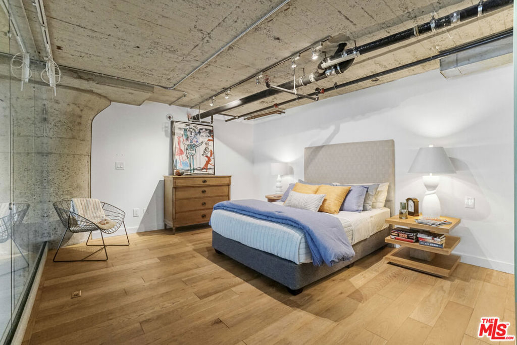 This is a rare opportunity to own a truly distinctive ground-level residence in the iconic Toy Factory Lofts, ideal for those seeking a highly flexible space that can comfortably support creative or studio use within a residential setting. Originally built in 1924, this historic 121-unit building blends preserved industrial character with thoughtful modern upgrades. Uniquely positioned as the only residential unit on the ground level, the home features a private, street-level entrance, offering exceptional flexibility for hosting and entertaining while maintaining residential privacy. The open layout naturally lends itself to studio configurations, making it especially appealing to artists, designers, photographers, collectors, and creative professionals. Soaring ceilings and oversized industrial windows flood the space with natural light, enhancing both functionality and visual impact while providing expansive wall space and adaptable floor planning. The one-bedroom layout includes two full bathrooms and a walk-in closet, allowing for clear separation between living and creative zones. The open kitchen is well equipped with an induction cooktop, dual convection oven and microwave, dishwasher, and refrigerator, ideal for extended days or entertaining. Hardwood floors run throughout, and soundproof windows provide a quiet, refined interior despite the surrounding urban energy. An in-unit washer and dryer add everyday convenience. Recent upgrades include a new HVAC system installed last year, a smart Nest thermostat, and smart recessed lighting, well suited for controlled ambiance and flexible use. Residents enjoy a full suite of amenities including a pool, barbecue area, landscaped garden, fire pit, expansive rooftop common areas with sweeping skyline views, and a two-level gym. A convenience store is located on-site, and Hank's Organic Supermarket & Grill is directly across the street. EV charging is available throughout the garage. Parking is a standout feature, with two assigned tandem garage spaces, offering rare convenience for owners and visitors and making this ground-level residence especially functional. Security and peace of mind are addressed with a gated entrance, video surveillance, security patrol, and full-time doorman service, complemented by active Arts District Business Improvement Team patrols. Located along one of the Arts District's most dynamic and creative corridors, you are surrounded by studios, dining, and cultural destinations, making this an exceptional opportunity for those seeking an inspiring, flexible residence with strong creative and studio potential.