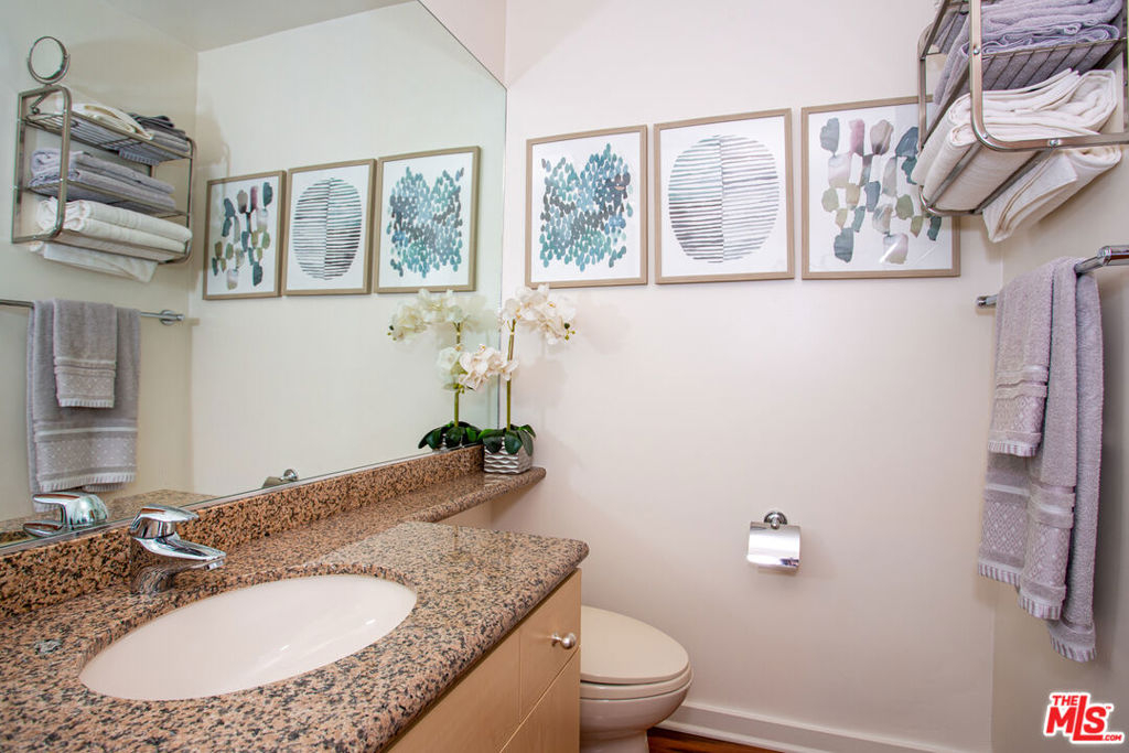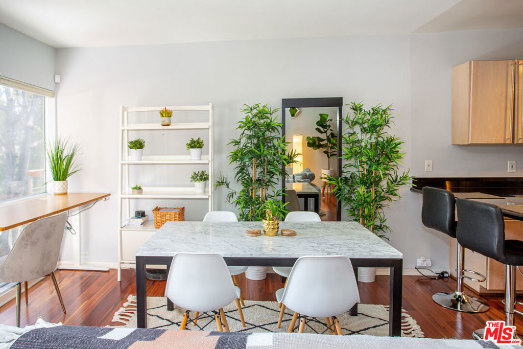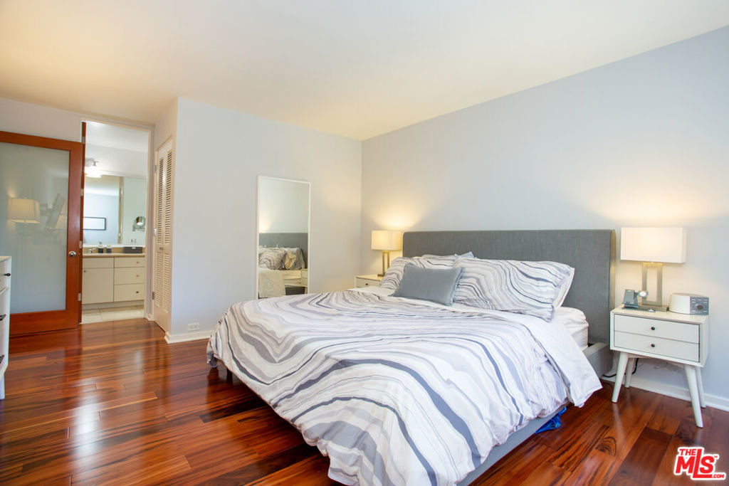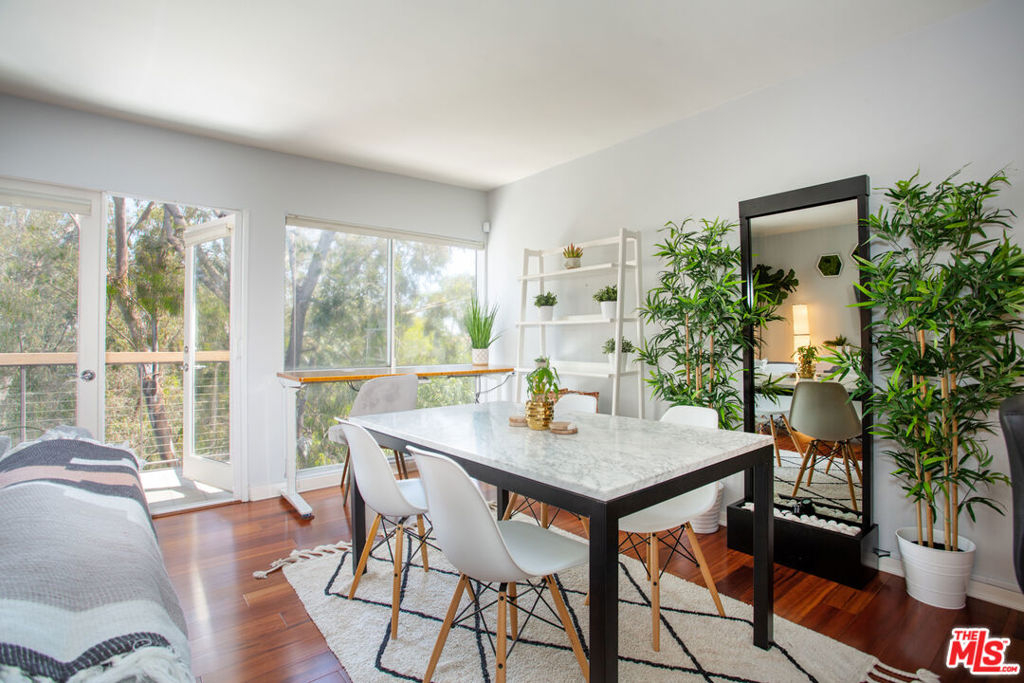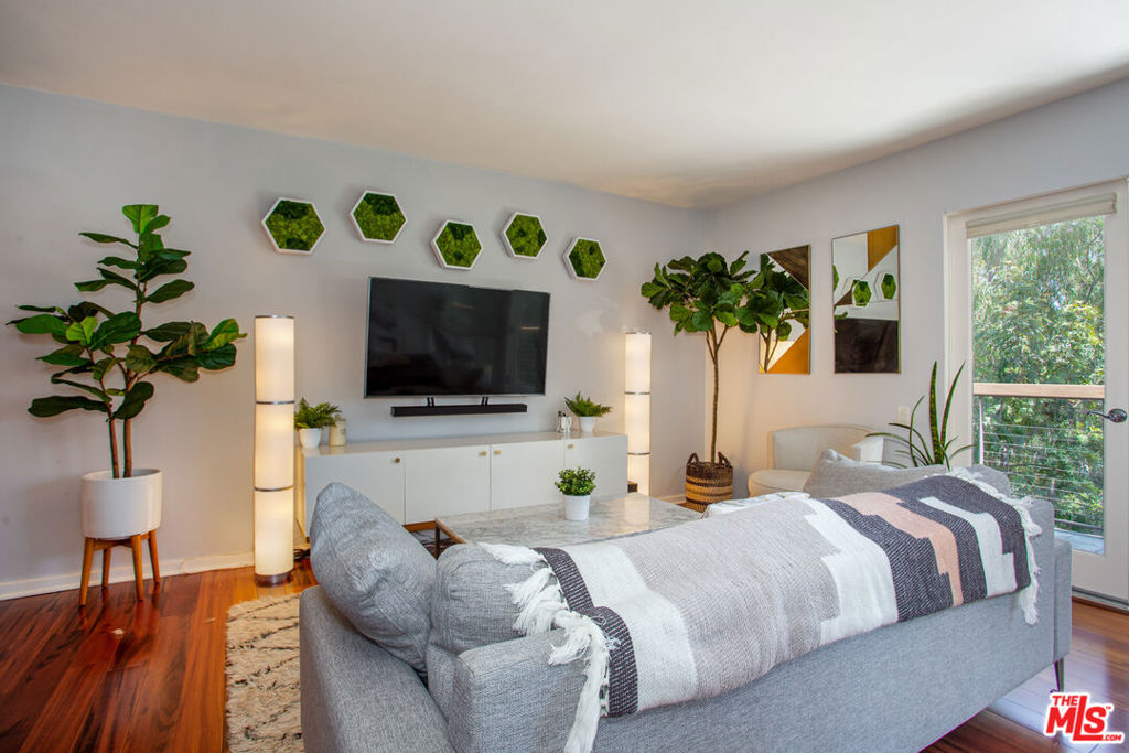 Move right into this updated contemporary single level top floor condo. The unit is situated in a prime location on the quiet rear side of the building with sweeping views of the tranquil woods and trees. Hardwood floors throughout the main areas with a spacious living room and dining room area. The updated kitchen comes with Black Granite, stainless appliances as well as a breakfast bar. There is a private patio off the living and dining areas where you can enjoy your morning coffee and newspaper while taking in the peaceful views. The generous Main Bedroom has its own en-suite bathroom with double sinks, walk-in closet and a large picture window to capture the magnificent view. There is a secondary guest bedroom and bath as well as a stack washer and dryer. The building has a security locked entry along with a pool and lounge deck, gym and secured parking garage. The building location is in close proximity to the charming Brentwood Village shopping Mall off Sunset Blvd, Barrington Recreation Center, Veterans Park with a dog park and popular San Vicente Boulevard with Brentwood's finest shopping and Dining just minutes away.