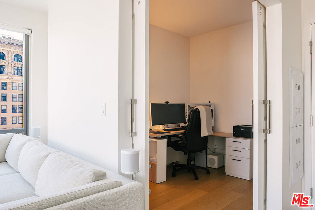 Rare corner unit with incredible south-facing views in Perla on Broadway. This 1-bedroom + den condo sits inside one of DTLA's newest architectural standouts and offers a clean, modern space that feels both elevated and effortless.Inside, the layout is open and airy, with hardwood floors, oversized windows, and city views that flood the space with natural light throughout the day. The flexible den works perfectly as a home office, creative studio, or guest space. The kitchen is dialed in with Bertazzoni appliances, sleek cabinetry, and a streamlined design that makes cooking and entertaining feel easy.Life at Perla on Broadway is all about the amenities. Residents enjoy 49,000 square feet of thoughtfully designed shared spaces, including a rooftop pool, fitness centers, lounges, and a 36th-floor observation deck with sweeping skyline views. The building also offers 24-hour security, concierge service, and low HOA dues that cover water, trash, and gas.The sale includes a designated EV parking space, a rare and valuable perk in the heart of Downtown.Right in the heart of DTLA's Historic Broadway corridor, walk to Grand Central Market, The Last Bookstore, Blue Bottle Coffee, Go Get Em Tiger, the Bradbury Building, Angels Flight, and The Broad, with restaurants, wine bars, galleries, and historic theaters just outside your door.