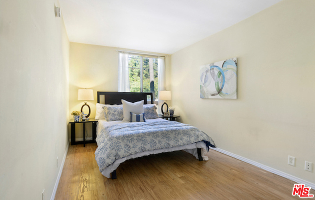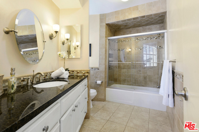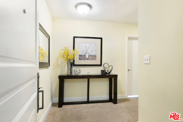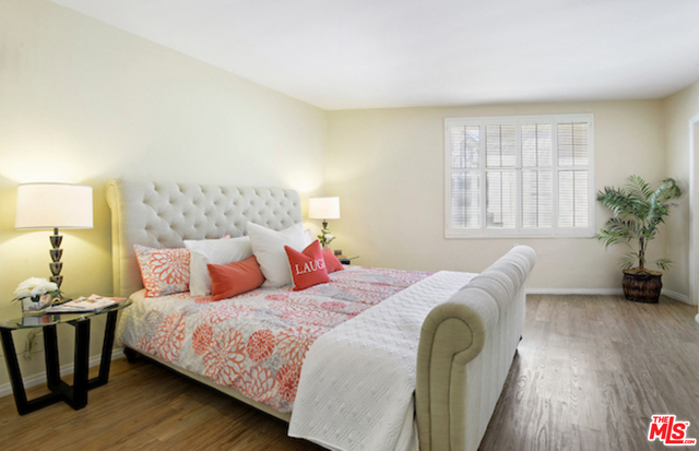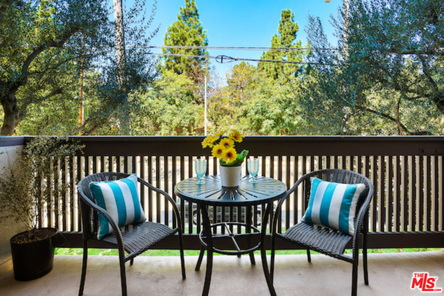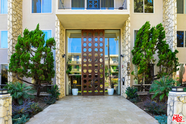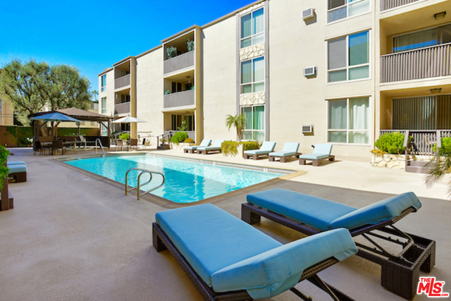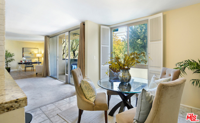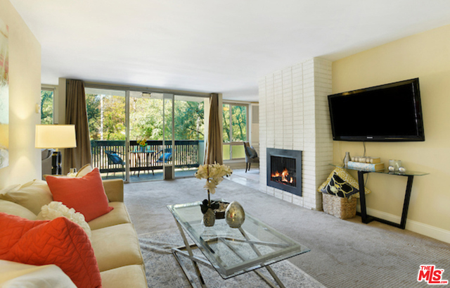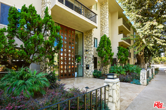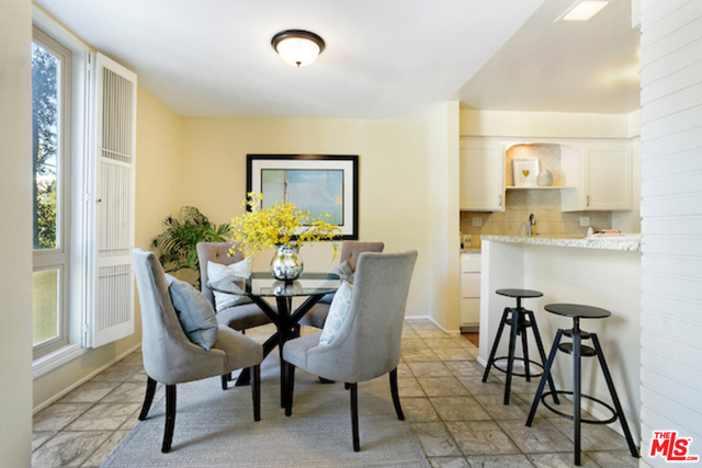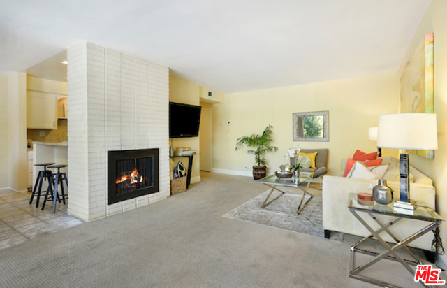 This magnificently updated, single-level mid-century residence features two bedrooms, two bathrooms, and a den/office - all in a recently renovated building in the heart of Brentwood. The stately entry hallway leads to an ideal layout with bedrooms on opposite sides for more privacy. The living room features a gas fireplace, mounted flat screen TV, separate den/office space with wet bar and walk-in closet, and sliding glass doors leading to a private balcony. The dining area has plantation shutters and a granite-topped breakfast bar. The kitchen has stainless steel appliances, upgraded granite countertops, and a stone back splash. The spacious master suite offers ample closet space and built-ins. The recently updated master bath features tumbled limestone and a glass enclosed shower. Two tandem parking spaces with a separate storage space. Smartly remodeled hallways lead from the impressive two-story vaulted entrance and lobby. HOA dues include EQ Ins, Water, Gas, Trash and Cable TV.