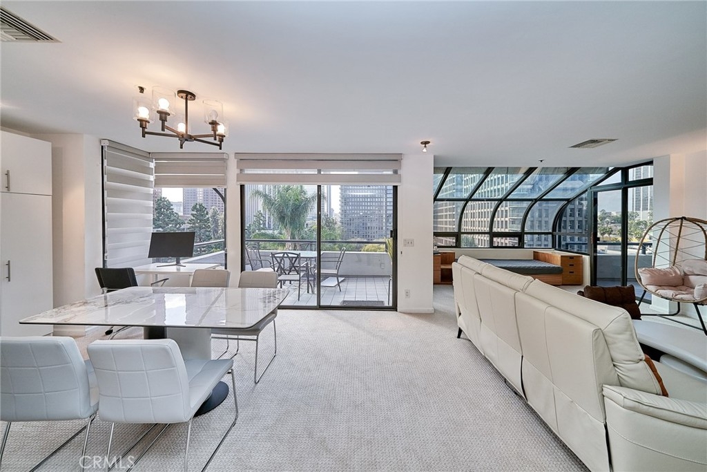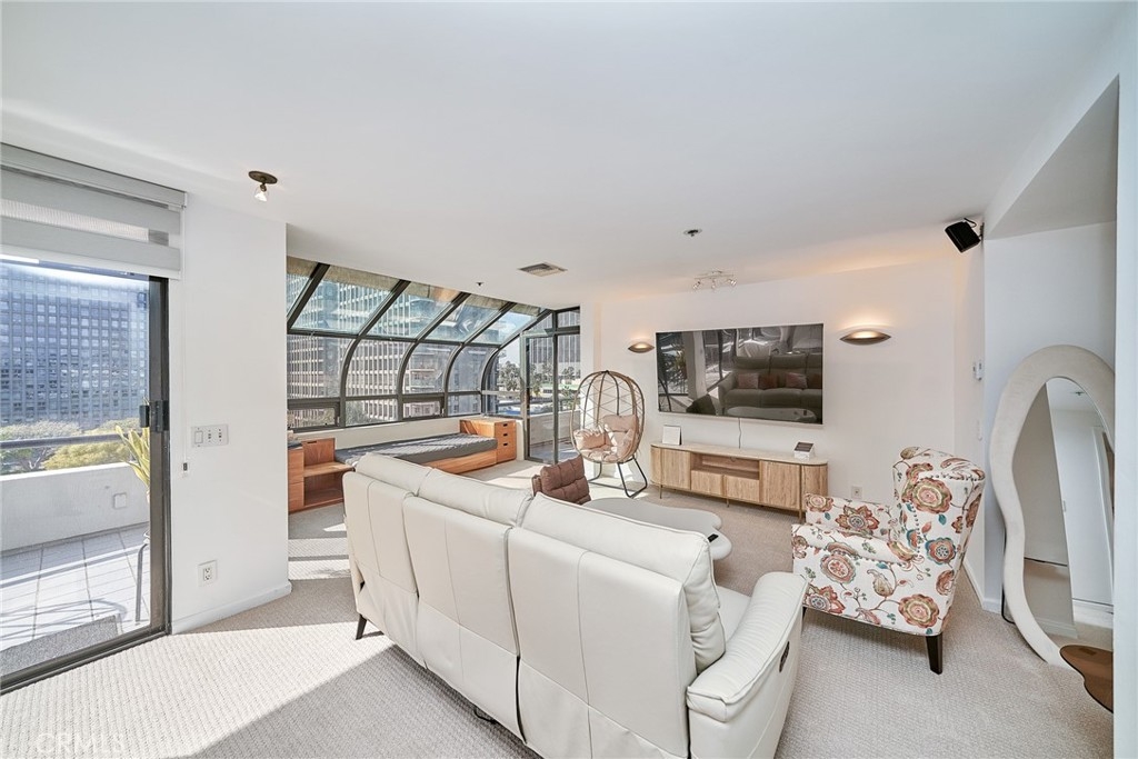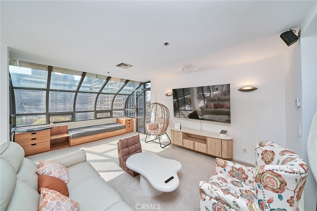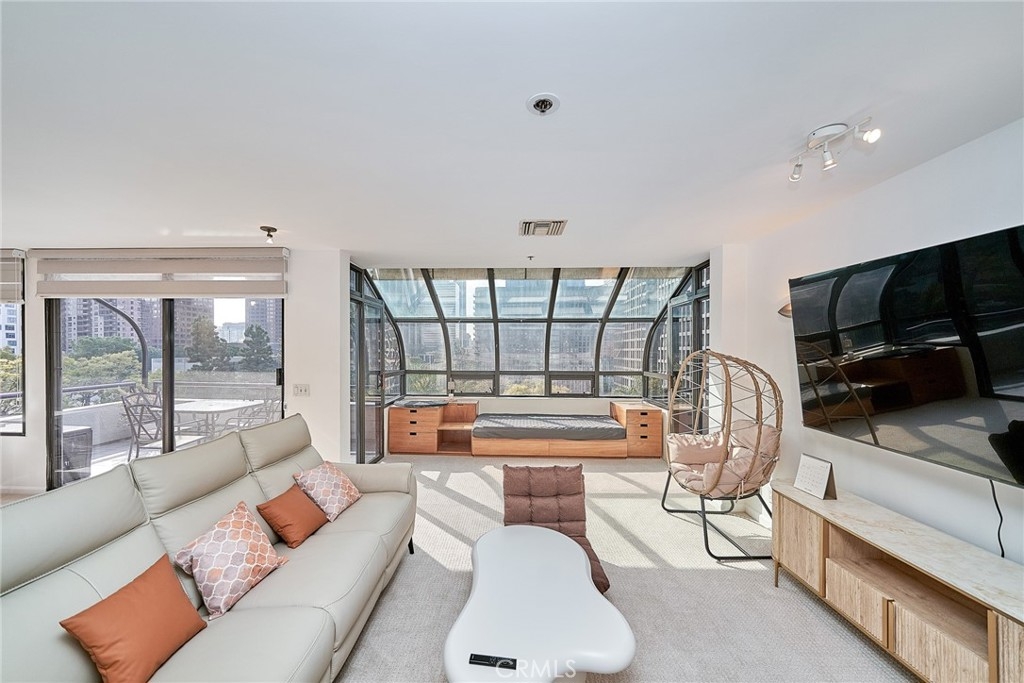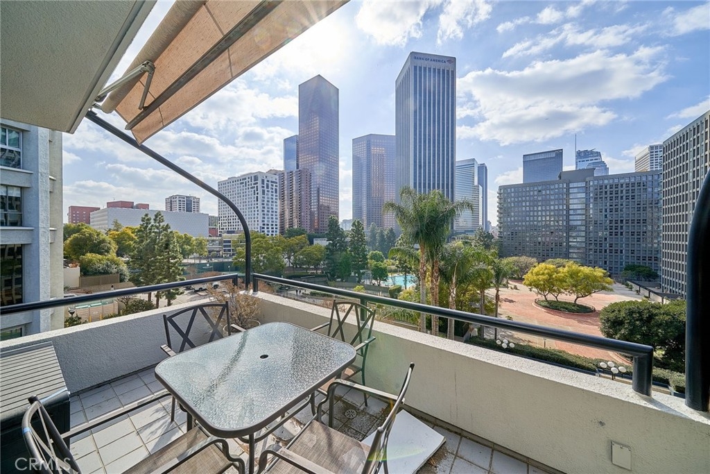 This beautiful penthouse unit in DTLA showcases the best skyline views and is a rare find at Promenade West Condos. Recently upgraded with new paint, carpets, and cabinets, the interior has been transformed. Spanning 1,028 square feet, it features a spacious, bright open floor plan with two large private balconies offering stunning downtown skyline views and equipped with folding shades. Natural light pours in from the south, providing sweeping vistas of the Broad Museum, the DTLA skyline, and courtyard palm trees. Designed by a professional, the interior includes built-in seating, ample storage space, and a stylish bar nook. The kitchen boasts new tile flooring, complementing the overall aesthetic. A generously sized master walk-in closet with well-organized shelves adds convenience. Conveniently located, the unit includes one assigned parking space in the underground garage entrance, with additional spaces available for monthly purchase if needed. Promenade West offers luxurious amenities akin to a hotel, including 24-hour security, swimming pools, spas, exercise rooms, saunas, onsite management, and basic cable TV. Common areas feature onsite dog parks, lush green gardens, and serene waterfalls. Local amenities such as convenience stores, dry cleaners, and delivery services are within easy reach. The location is ideal for walking to nearby attractions including the Disney Concert Hall, Ahmanson Theater, Mark Taper Forum, Dorothy Chandler Pavilion, Grand Park, Broad Museum, restaurants, courthouses, city hall, and the Metro Regional Connector. HOA membership fees cover water, waste disposal, general liability/fire insurance, and earthquake insurance. Residents are responsible for electricity and internet costs.