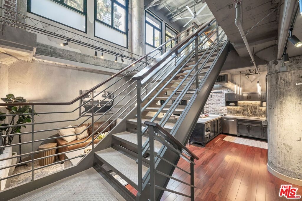A rare industrial-style live/work loft in the heart of South Park, this striking residence offers flexible space with direct street access on Grand Avenueperfect for modern urban living or a sophisticated work-from-home setup. Soaring ceiling heights, dramatic industrial columns, exposed brick, and an open atrium overlooking the living area below create a truly one-of-a-kind architectural statement.Originally acquired as raw space, the home was thoughtfully transformed with rich custom-laid wood floors, polished concrete, sealed exposed brick, industrial girders with gallery lighting, diamond-plate steel stair treads, and custom banister details. The enclosed lower-level primary bedroom features custom doors and a skylight panel, while updated systems and laundry in unit add everyday convenience to the loft's bold design. The unit includes assigned parking space and access to resort-style amenities located next door at Aven: an outdoor pool deck, indoor lounges, fully equipped fitness center, beach volleyball and basketball courts, BBQ grills, cabanas, and more extending your living space beyond your front door.Ideally located in the vibrant South Park neighborhood, enjoy effortless access to LA Live, Crypto.com Arena, the Los Angeles Convention Center, Whole Foods, FIDM, Metro access, top-tier dining, coffee shops, entertainment venues, and Regal Cinemas.This is elevated downtown living where luxury, flexibility, and lifestyle converge.